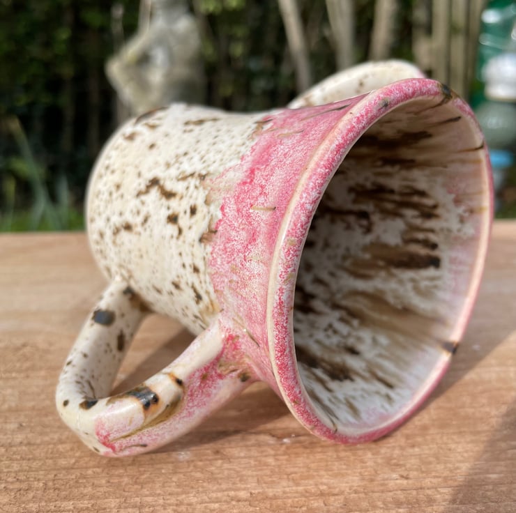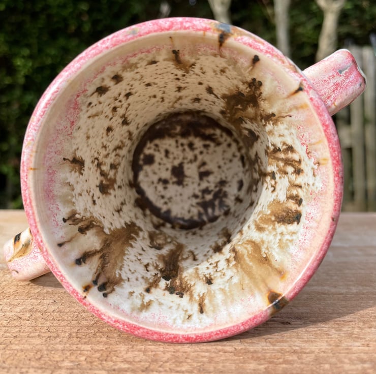 The mug was dried slowly once the handles were added over a few weeks. It was then fired to over 1000c, called a bisque firing. It was then glazed and fired again to over 1200c. This is when the magic happens and the glazes run into each making the individual look of the Made With Mud mug.