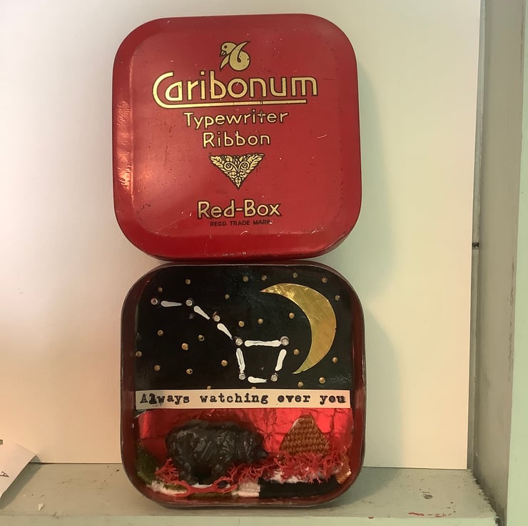 This is a lovely little piece made using vintage materials. The bear is a vintage lead toy, the tin is from a vintage type ribbon and the moon has been made from a tomato purée tube.