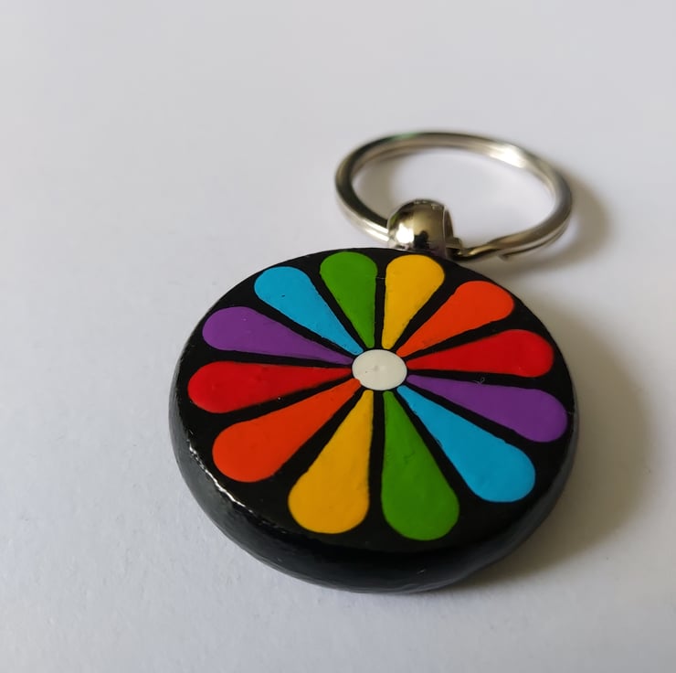 The keyring is double sided, with the rainbow flower painted on both sides.