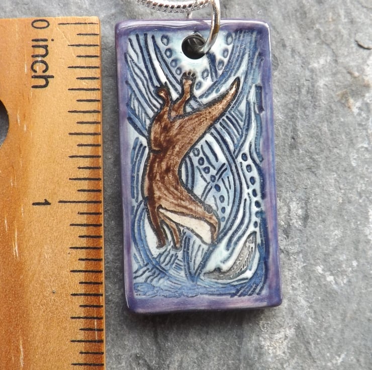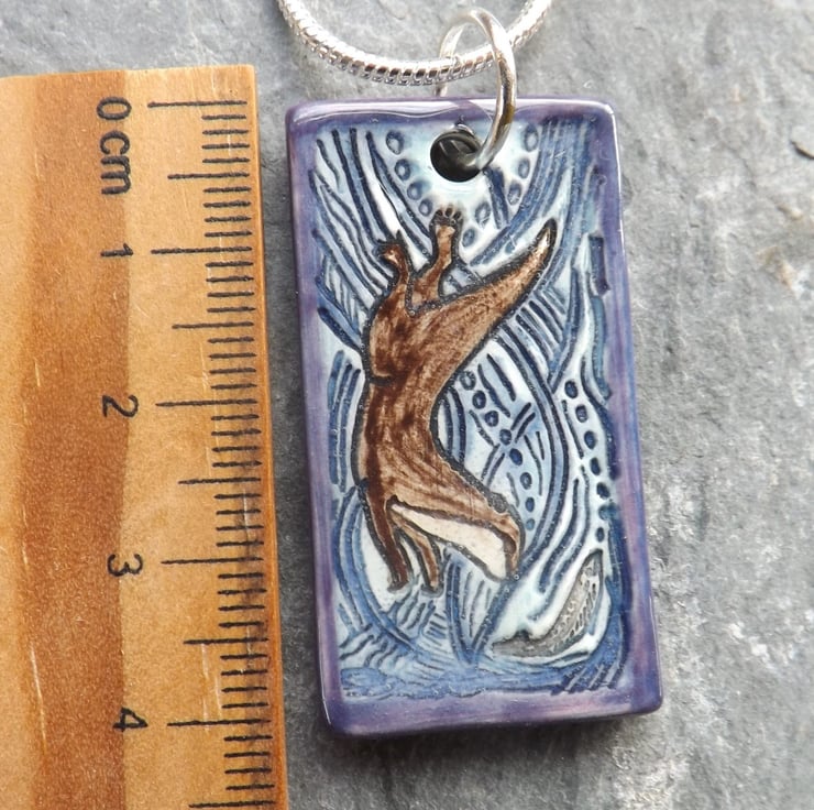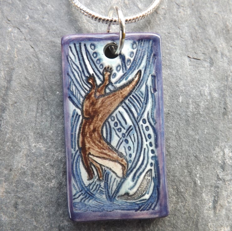 This pendant features an otter diving in pursuit of a fish, with water and weeds swirling in the background.