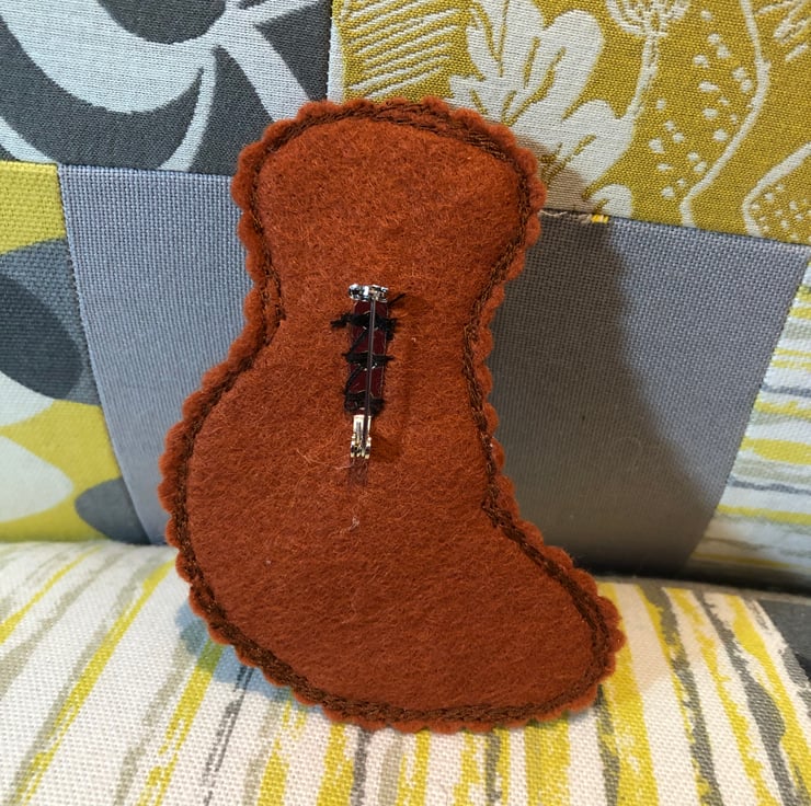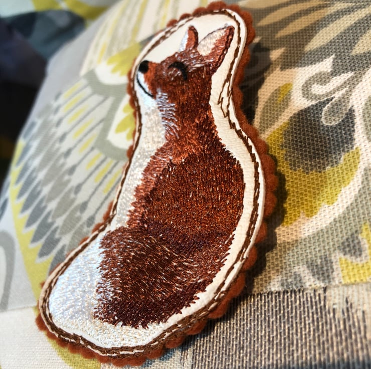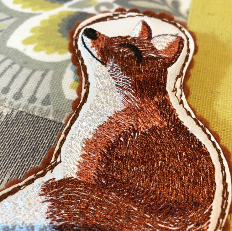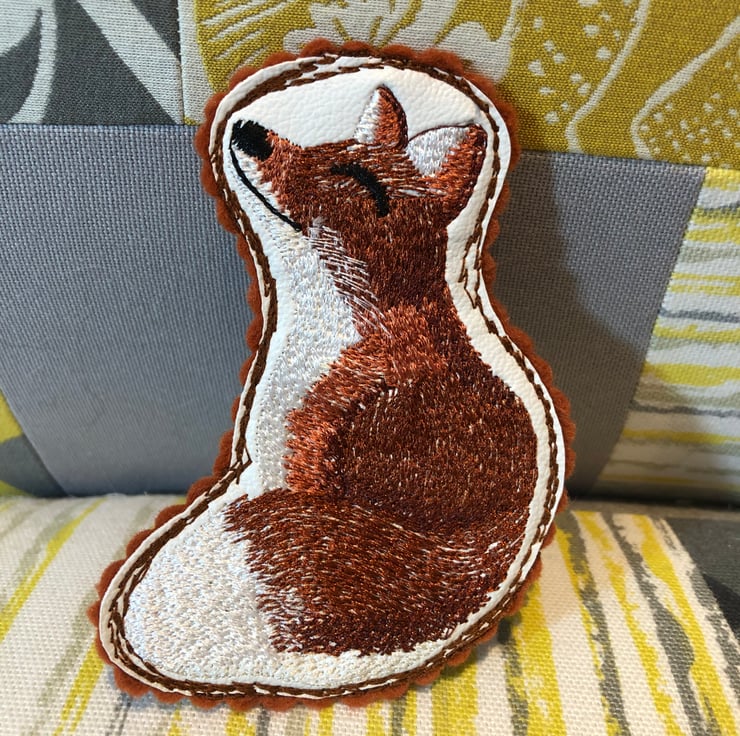 Machine embroidered fox design stitched onto faux leather then stitched on my sewing machine with free motion stitching and attached onto a felt back.