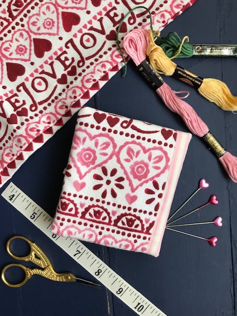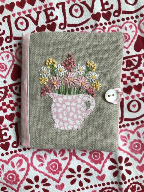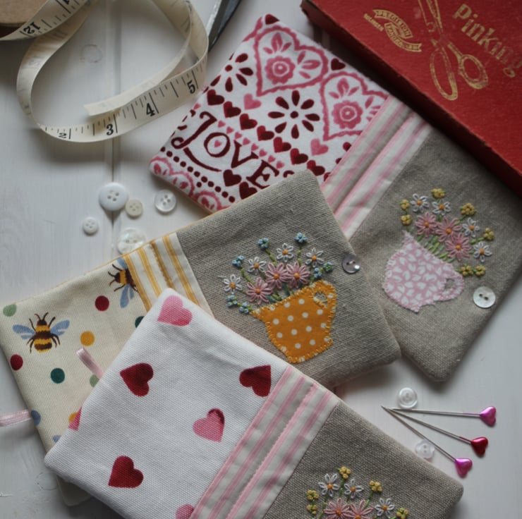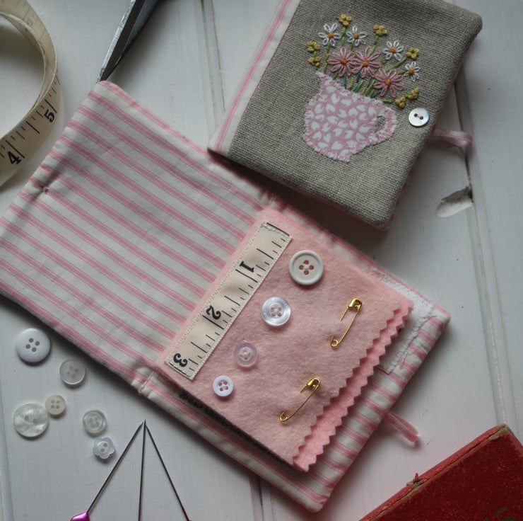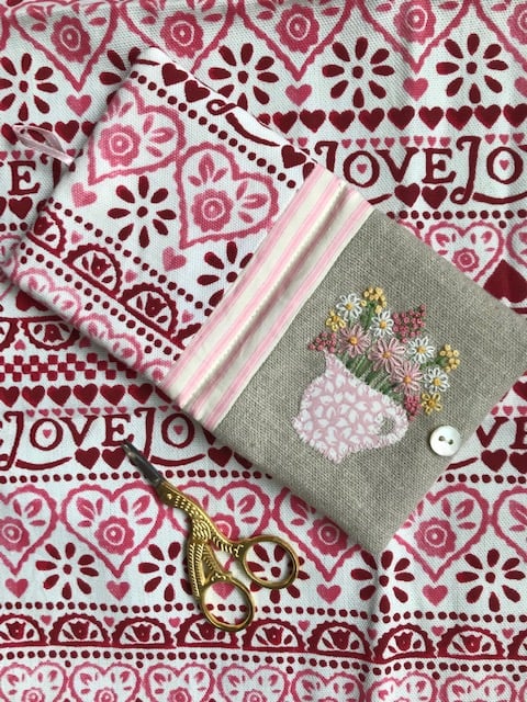 Sweet little needle case featuring an appliqued jug motif with hand embroidered flowers on the front, and Emma Bridgewater 'Sampler' fabric on the back.