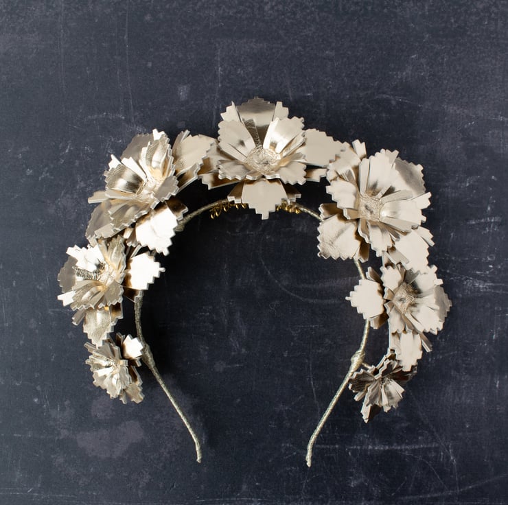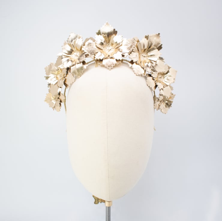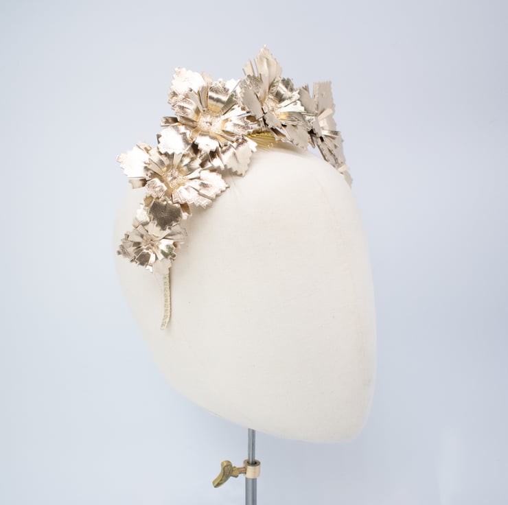 This beautifully crafted gold leather head piece would be perfect for your next day at the races, or as a unique, contemporary bridal crown.