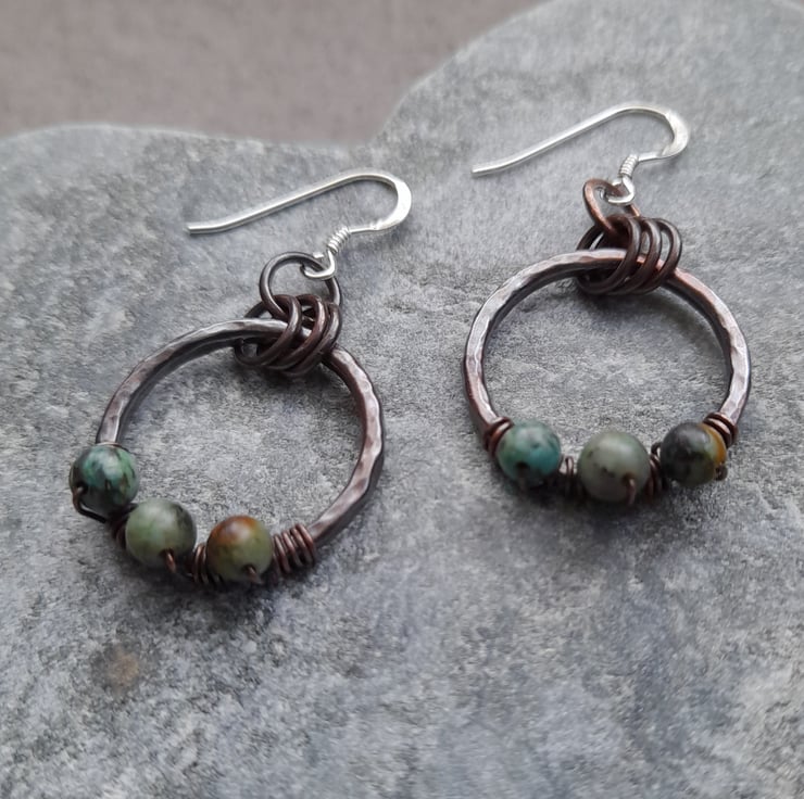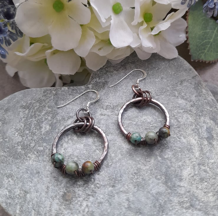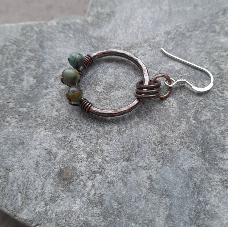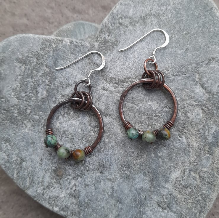 These earrings have been made out of copper wire which has been formed into a circle soldered and hammered to give texture and harden the wire hoops have then been oxidised to give an aged look .The copper hoops have been attached to sterling silver ear wires. Small african turquoise semi precious gemstones are attached .