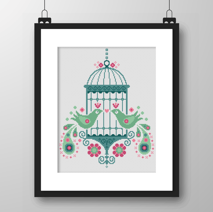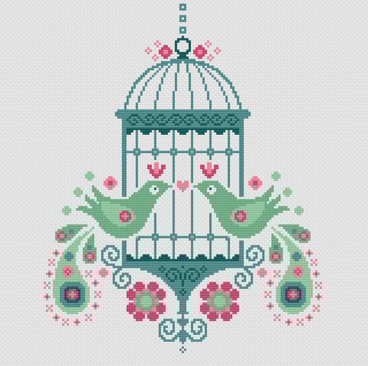 Cross stitch pattern cute Turtle Dove Love Birds with flowers and Birdcage, folk art cross stitch counted PDF chart by Vivienne Powers - 018