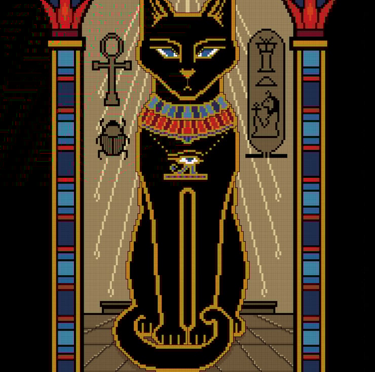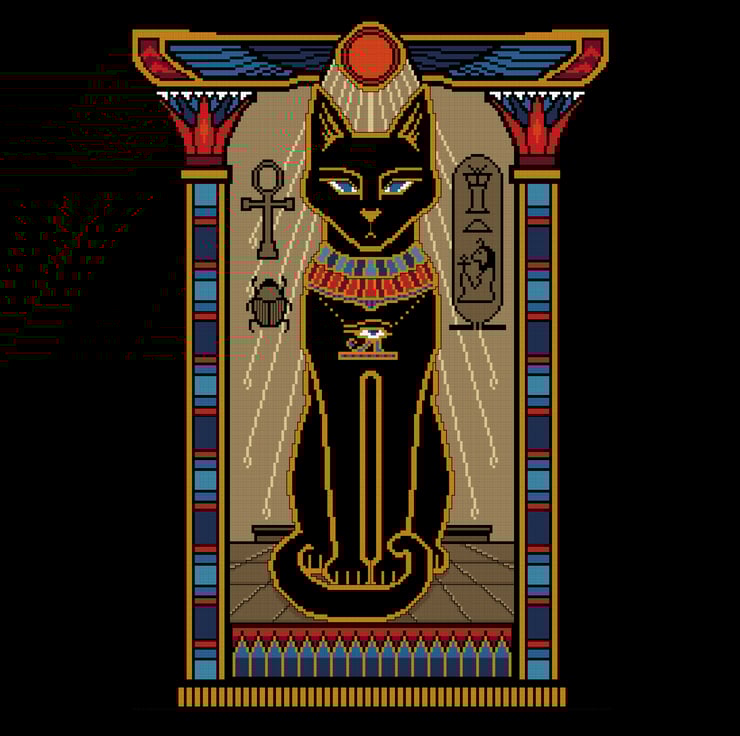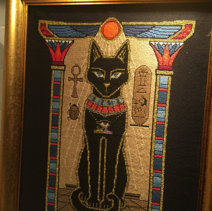 Ancient Treasures - Egyptian Temple Cat Bast with accurate Hieroglyphics, uses all the colours of Ancient Egyptian gold work and jewellery, the stunning La pis Lazuli, Turquoise and Carnelian used in the mask of Tutankhamen.