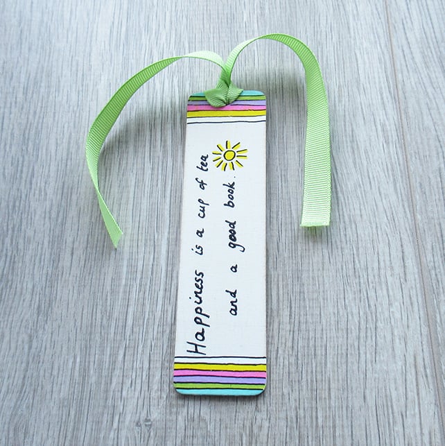 Hand painted using acrylic paints in bright spring colours, turquoise, yellow, pink, green, white & lilac in a curved stripe effect design on one side and on its opposite side it has a cream background with the text ‘Happiness is a cup of tea and a good book’.