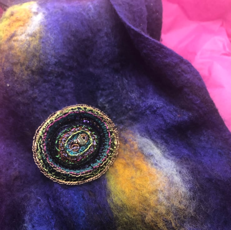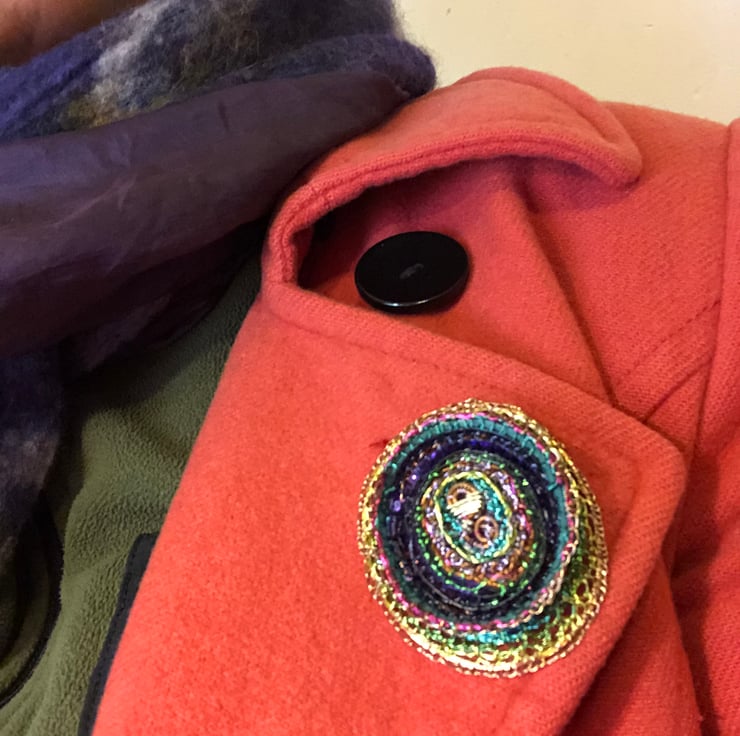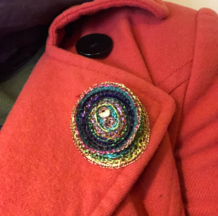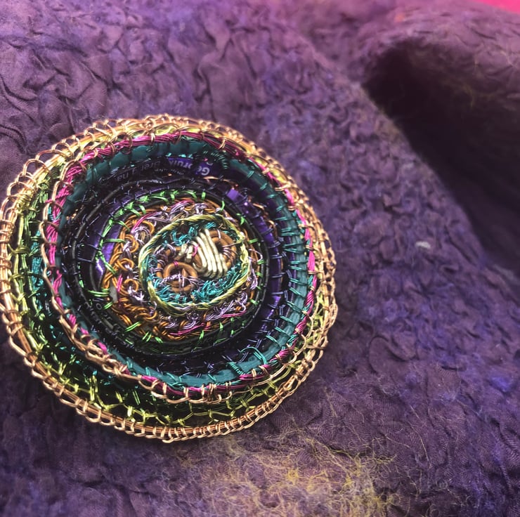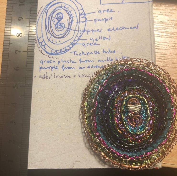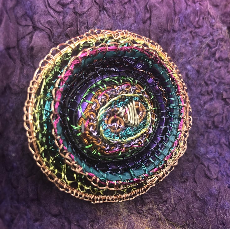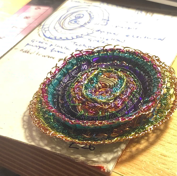 Oval brooch made of wire wrapped around different recycled plastics and coiled with a wire stitched edge.
