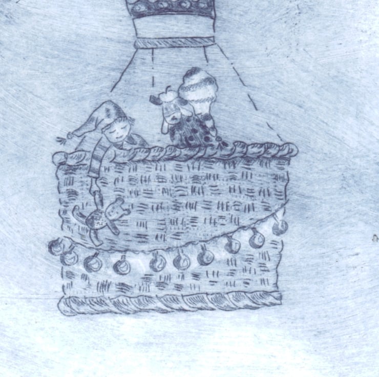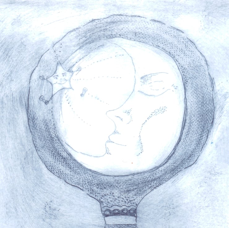 Drift away with this cute original drypoint etching. Would look lovely in a nursery as your little one travels to the land of nod. Printed in Prussian Blue one 370gsm Lambeth paper.
