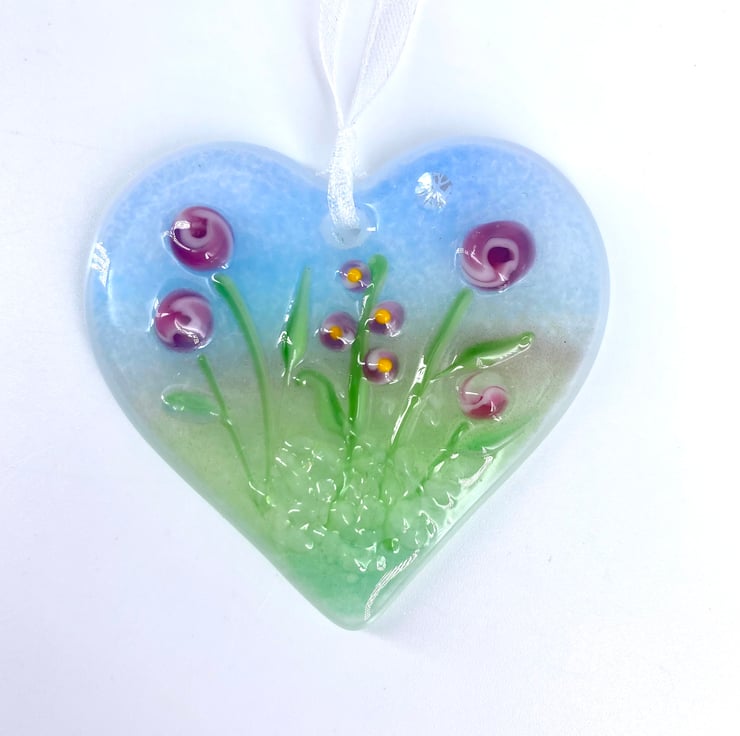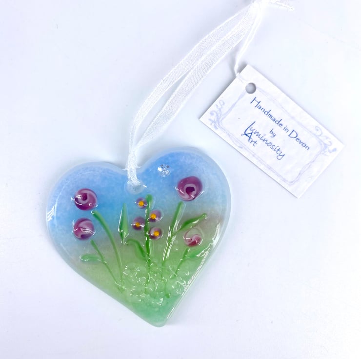 This gorgeous little heart is a mini work of art and no two are the same. It has had two firings in the kiln and the detail is made up from tiny pieces of lamp worked glass with sparkly elements of dichroic glass.