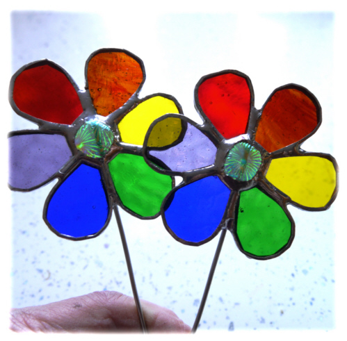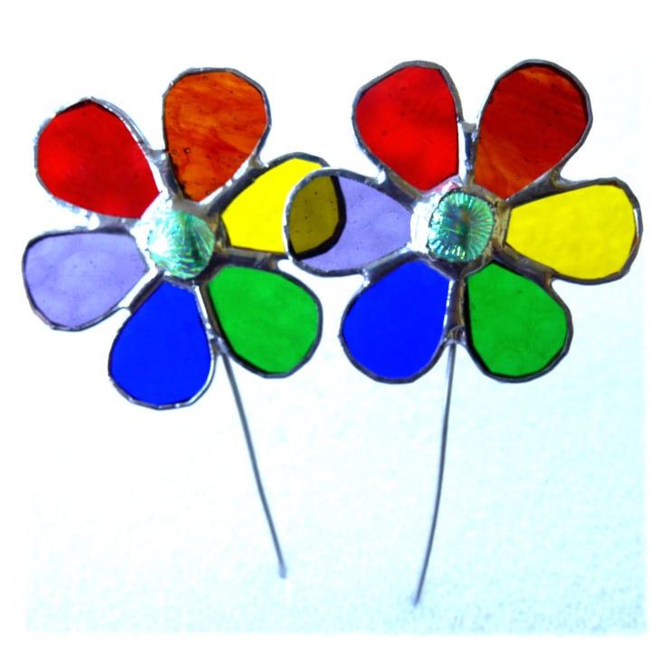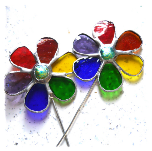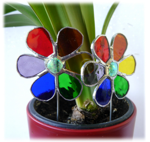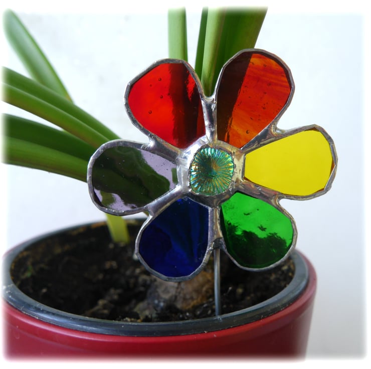 The rainbow flower is securely attached with solder to a short length of copper tinned wire and is designed to sit in an indoor plant pot.