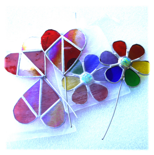 A stained glass bright rainbow 6 petal flower cut from six different types and colour of glass and handmade using the Tiffany copper foil technique.