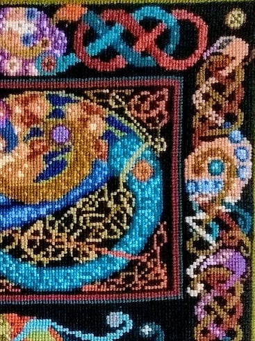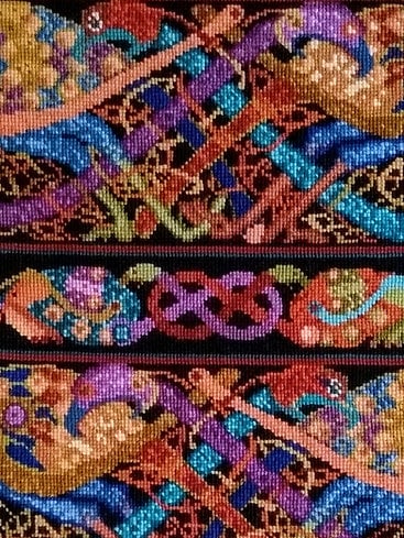 This large tapestry was inspired by the entwined peacocks, which are found throughout the Book of Kells.