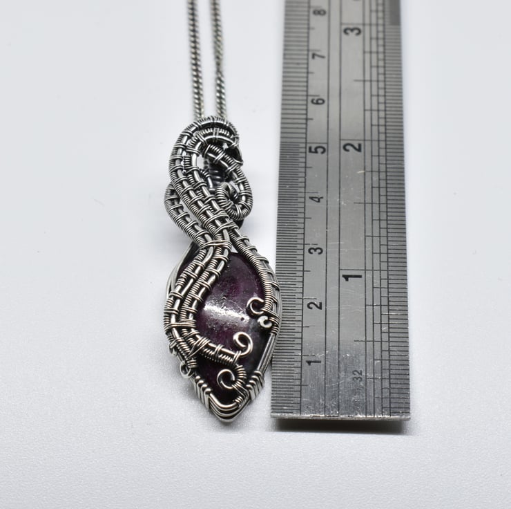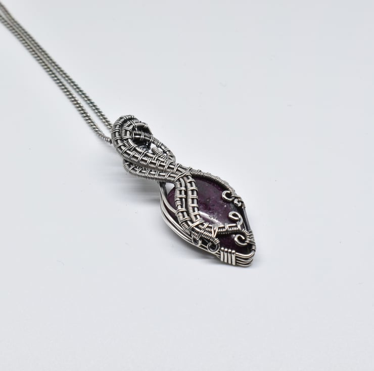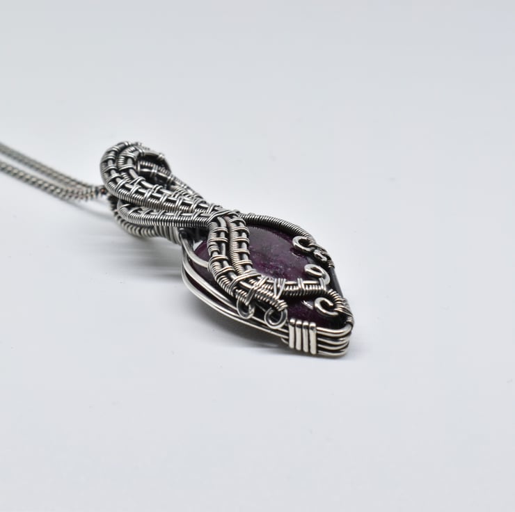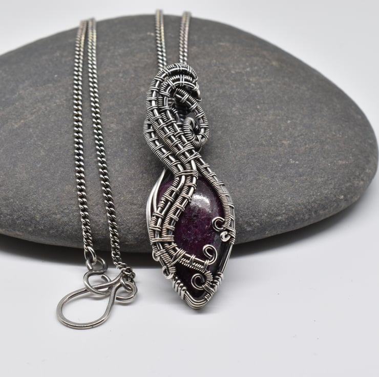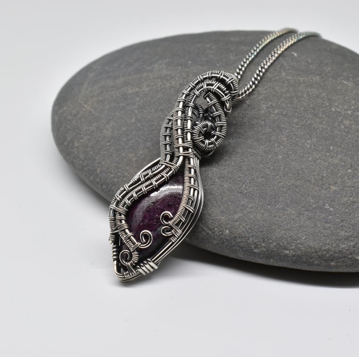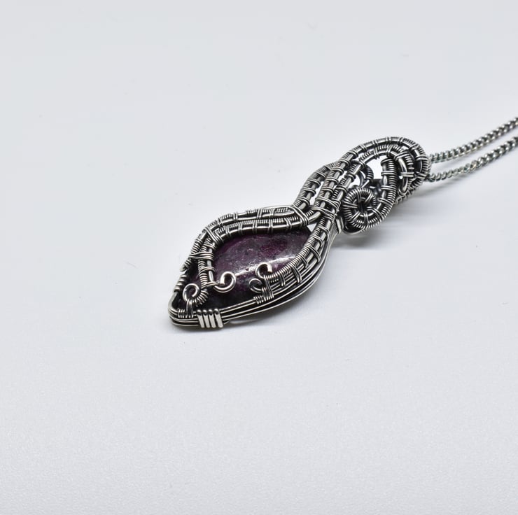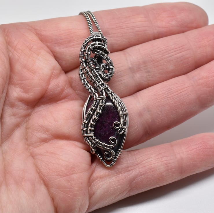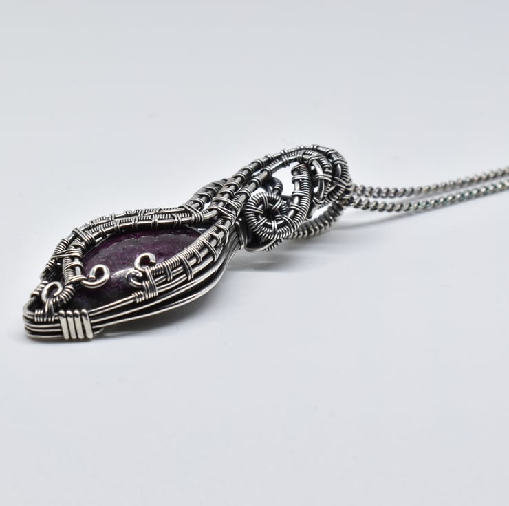 I have used sterling and fine silver wire to wrap and weave around this pretty ruby to make this striking necklace.
