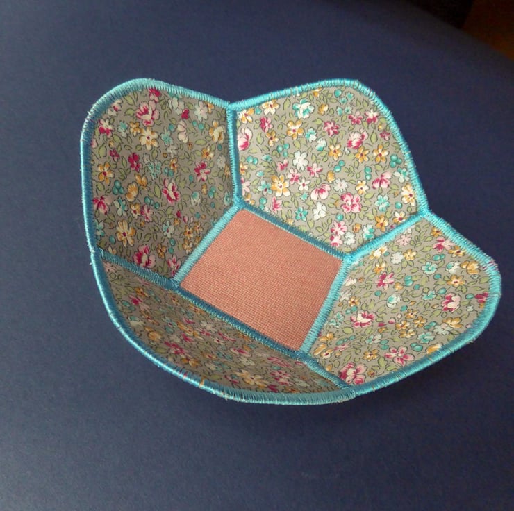 I find these little bowls so useful and attractive. I so enjoy creating matching fabric designs and colours. Satin stitching is fun to do on the machine to shape and mould. I hope you will love your bowl as much as I have loved creating it for you.