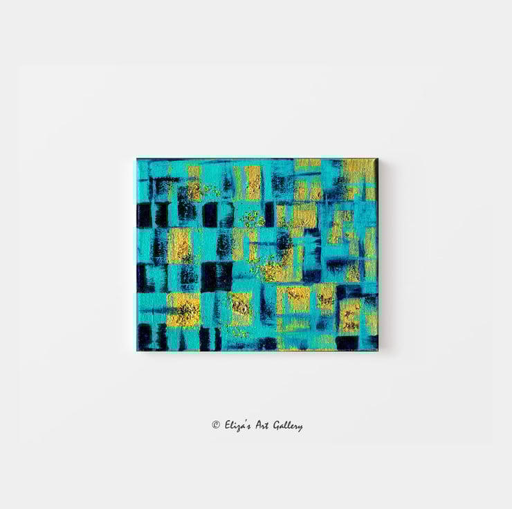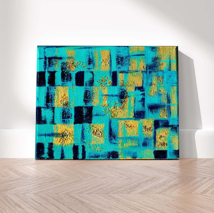 An Original Abstract Acrylic Painting on a Stretched Canvas. I have used Professional Quality Teal, Gold and Blue Acrylic Paint with Glitter and Gold leaf.