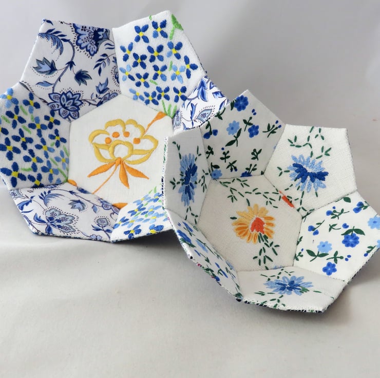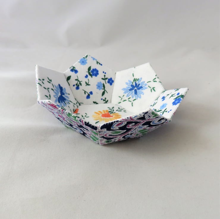 A pretty vintage embroidered linen hexagonal base, surrounded by six pentagons - three of vintage linen and three of coordinating printed cotton - form this pretty bowl. Each fabric patch is folded over a template of interfacing which remains in place in the completed bowl to add structure.