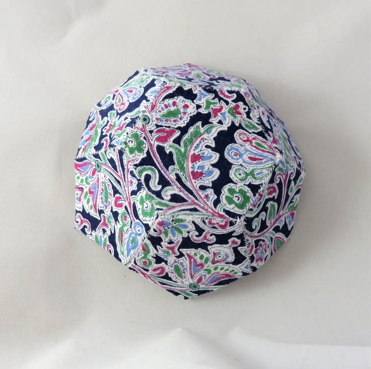 I love traditional hexagonal patchwork. I wanted to try to make three dimensional items and this combination of pentagons with a hexagonal base produced this pretty bowl.