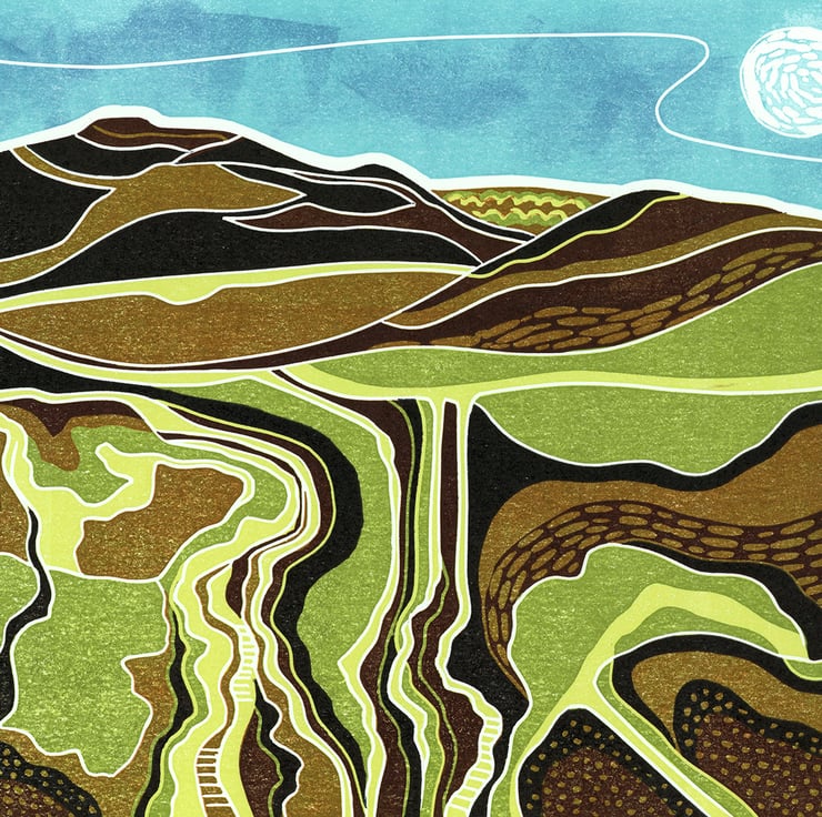 This landscape print shows a ghostly image of the moon rising over the Clwyd Hills in North Wales. The sky is still blue on a midsummer evening, over a steep, rugged hillside of flowing lines & tracks. This area is a hiker`s paradise & this image would make a great gift for someone who enjoys a good walk over the hills