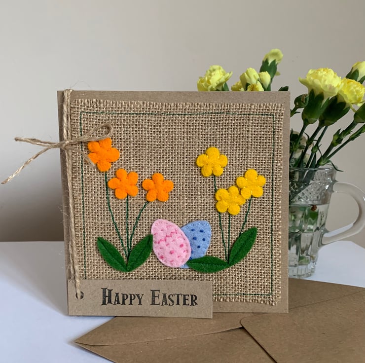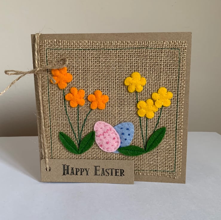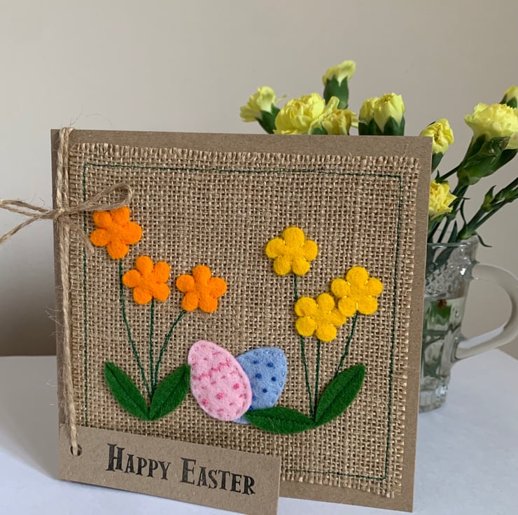 This Easter greeting card is decorated with flowers in orange and yellow alongside decorated eggs a in pale pink and blue. The decoration is hand cut from 100% wool felt and sewn by hand and machine onto a hessian background.
