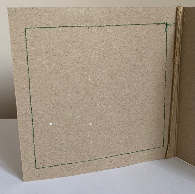The hessian is machine stitched, using a contrasting thread, onto a plain brown recycled card. This stitching is visible on the inside of the card.