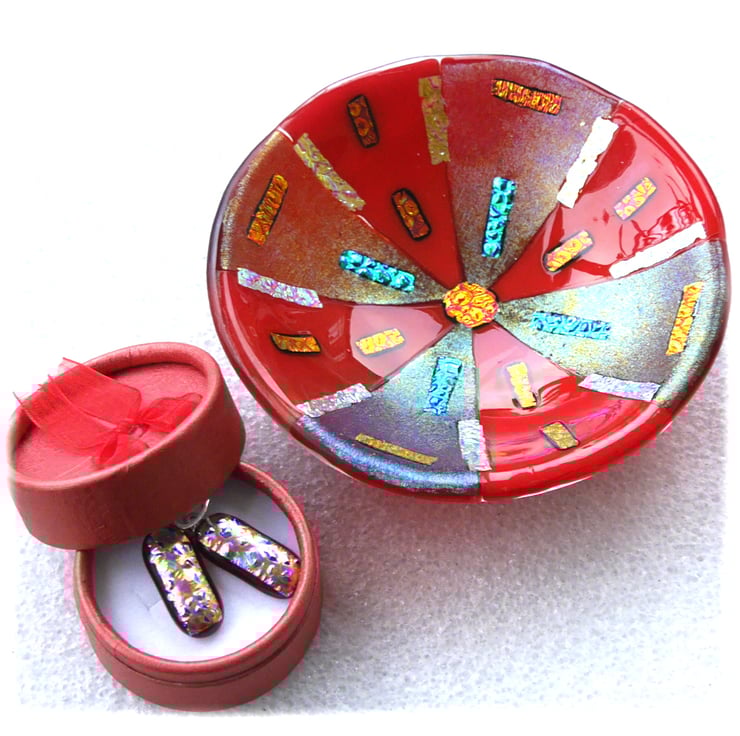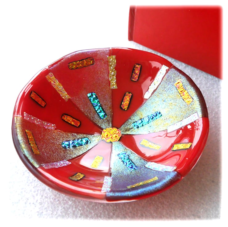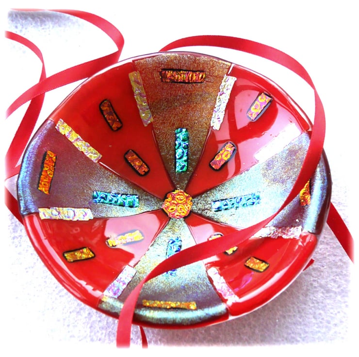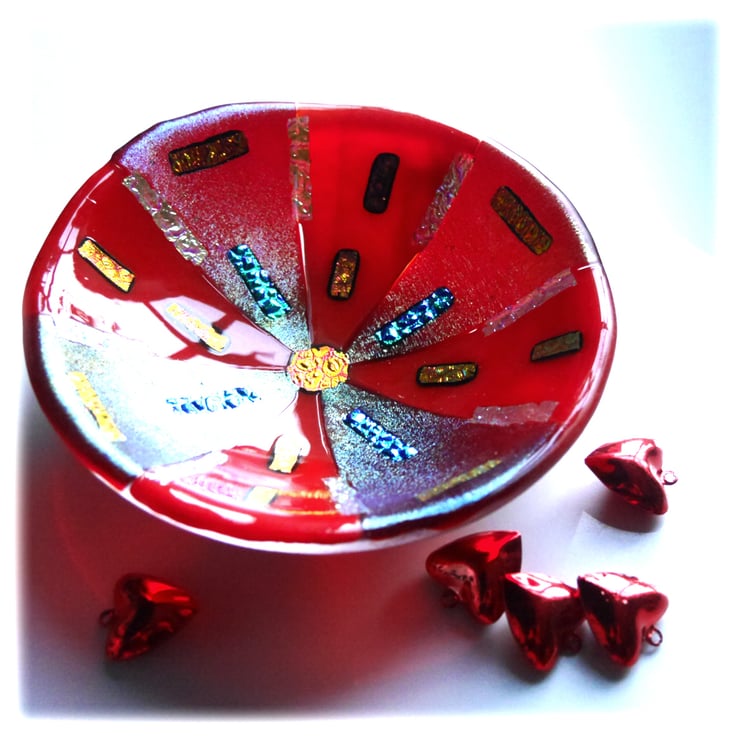 This is fused glass bowl, twice fired to very high temperatures in my kiln, first to fuse all the glass together as a flat circle, 2nd to slump it over a little mold into a dish.