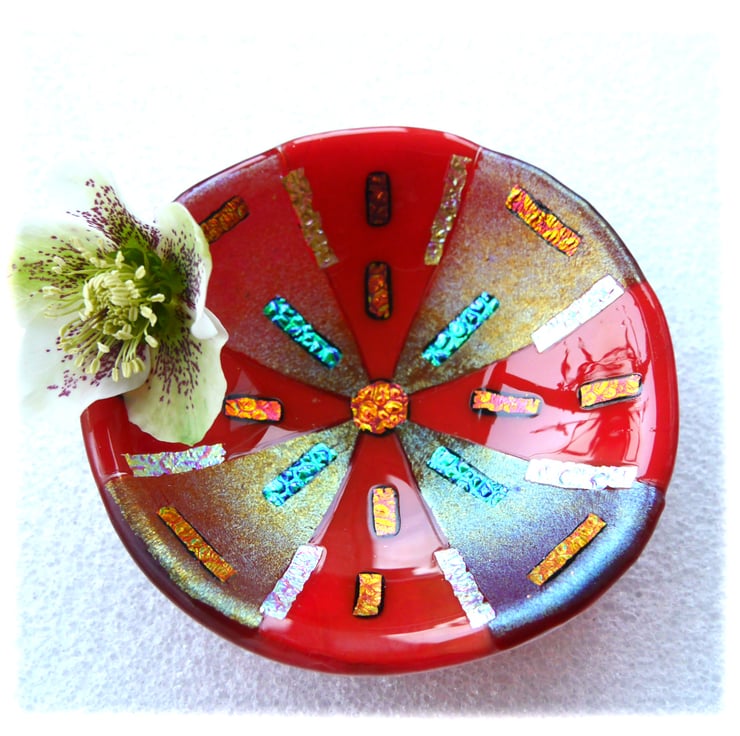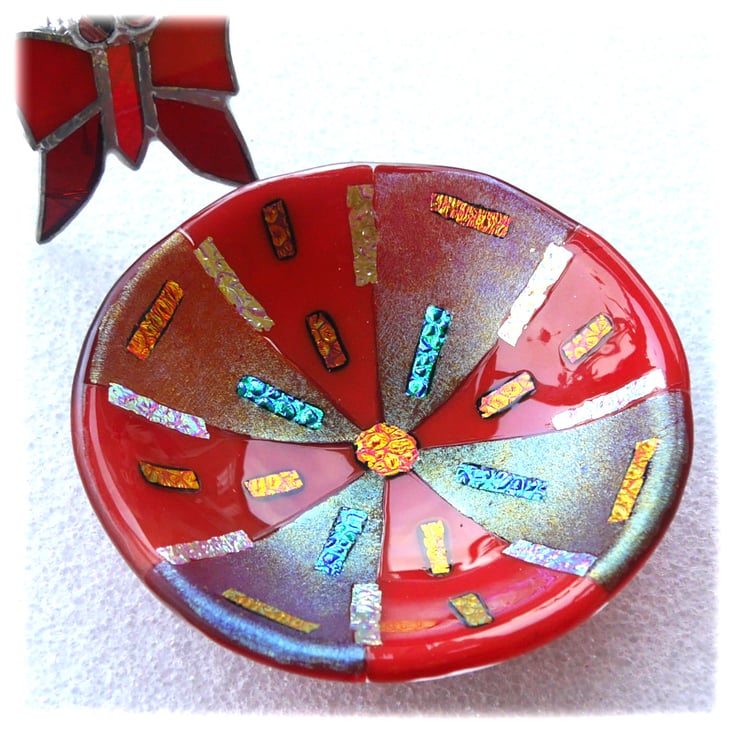 This round dish has a base clear glass. On top of that is a layer of red glass, two types in alternating segments. One red is iridescent with a deep shimmer, the other slightly streaky and a little more opaque.