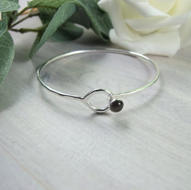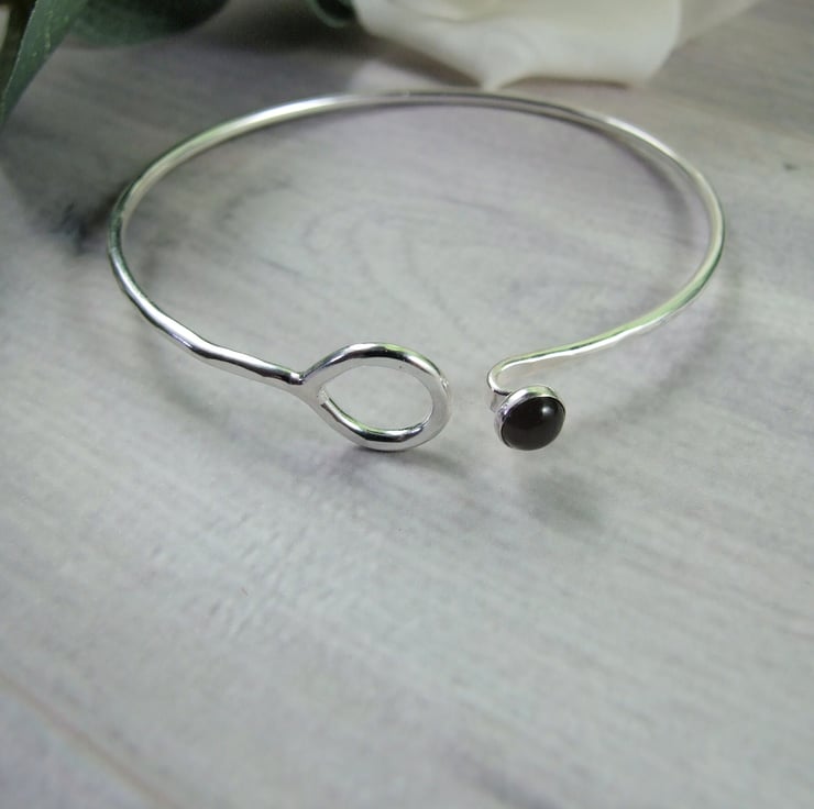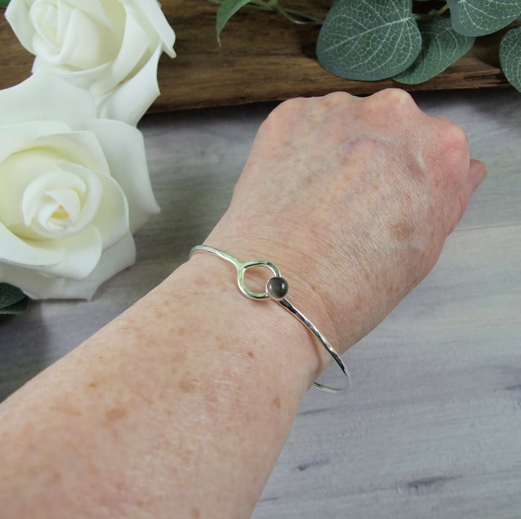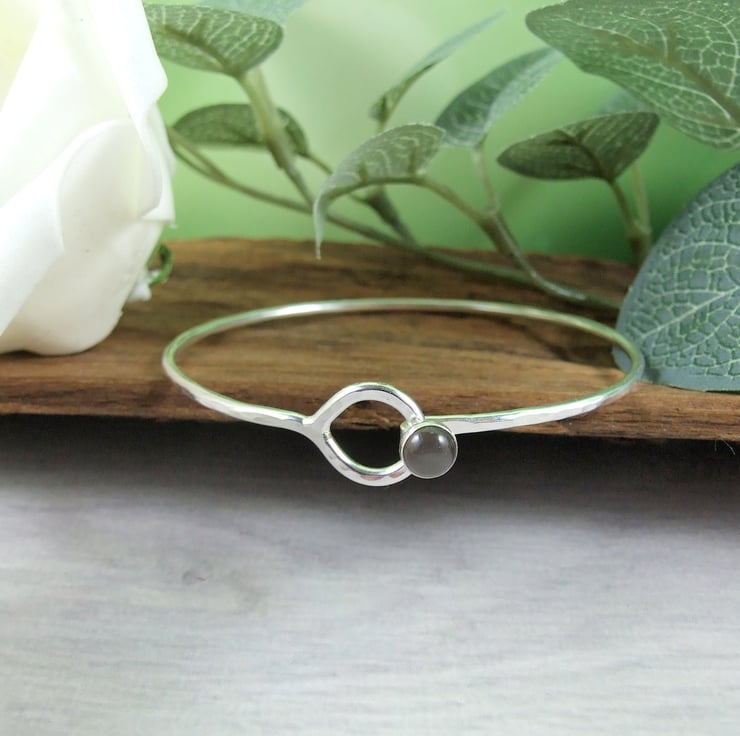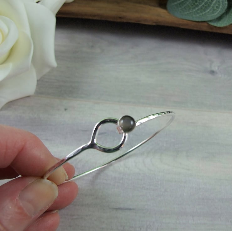 I have made the bangle from 2mm wide solid sterling silver wire which I have soldered sanded, shaped and polished. At one end of the bangle is a circle soldered closed and the other is a small hook topped with a silver bezel cup set with a 5mm grey moonstone gemstone.