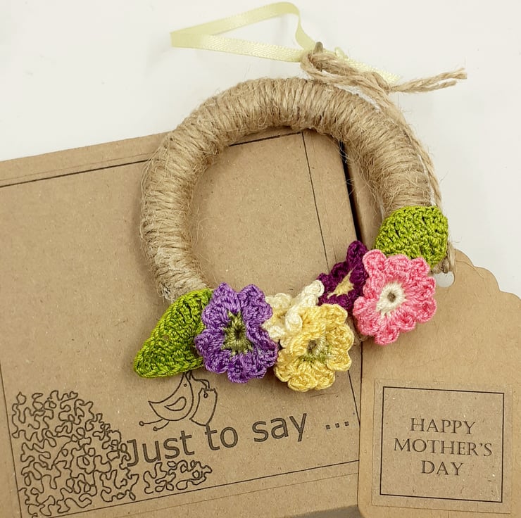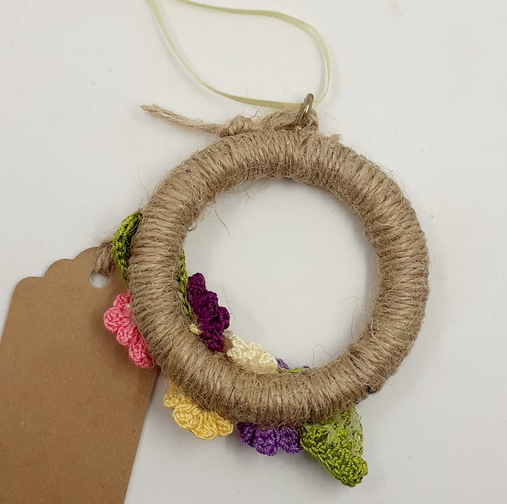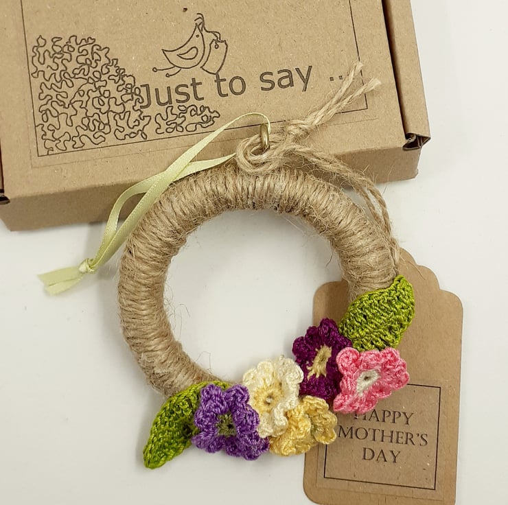 alternative to a greetings card. The flowers are crocheted in fine cotton and glued to a wooden ring which has been wrapped in jute twine. The mini wreath measures approximately 7.5 cm in diameter and would be perfect hanging from a cupboard handle, hook or Easter branch. There Is a tag attached which reads Happy Mother's Day, although I am very happy to exchange this tag for one with a message of your choice to suit any occasion. The decoration comes wrapped in tissue in a labelled PIP ( Postage in Proportion) box, all ready to be given or posted on.