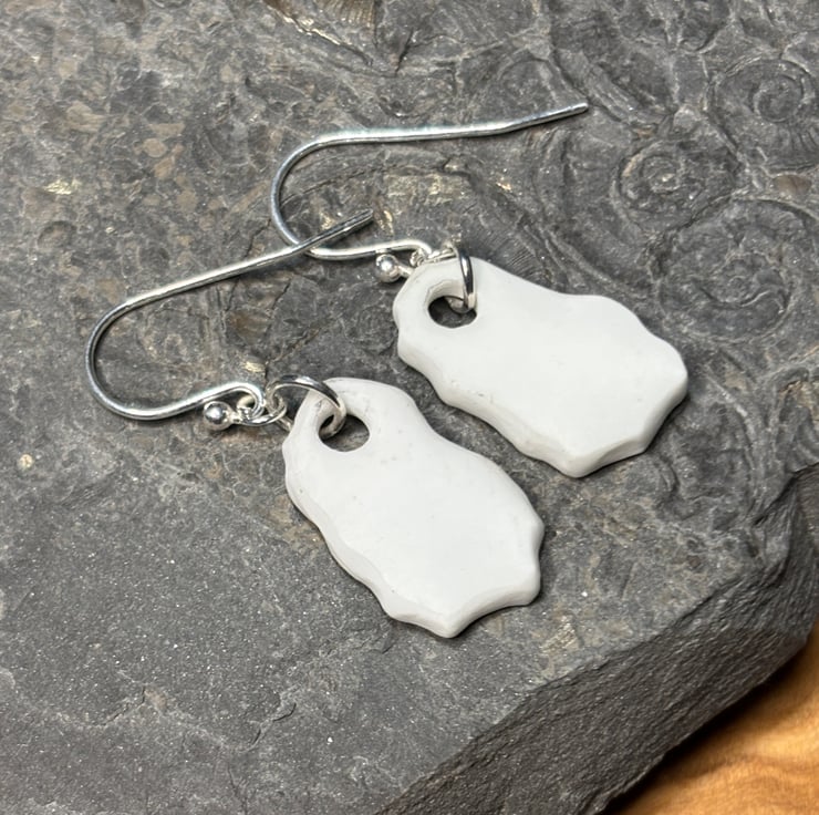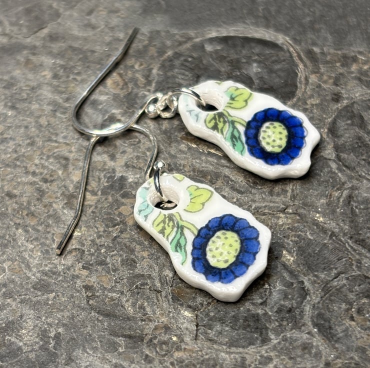 These earrings are made from one of the saucers, most of the pattern was worn away but two pretty blue flowers were still intact. I clipped the ceramic and thankfully both flowers survived, I decided to create these earrings with the flowers hanging upside down.