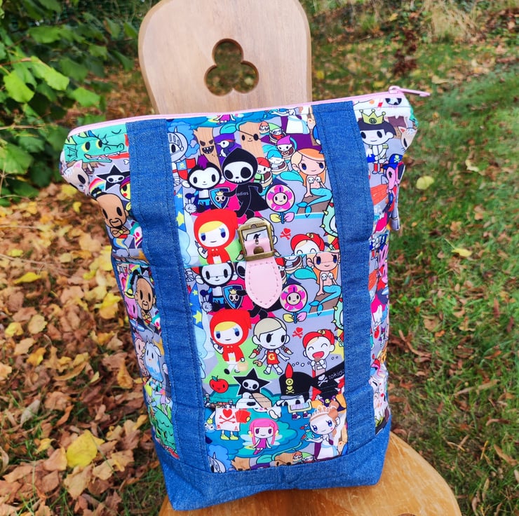 This lovely rucksack is a combination from different fabrics. Outside I combined tokidoki fabric with denim to emphasis the colourful fabric. The lining is a smooth hot pink cotton.