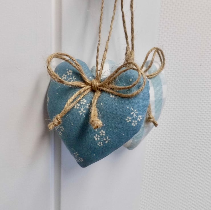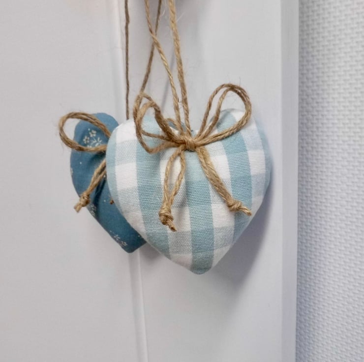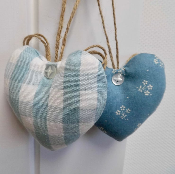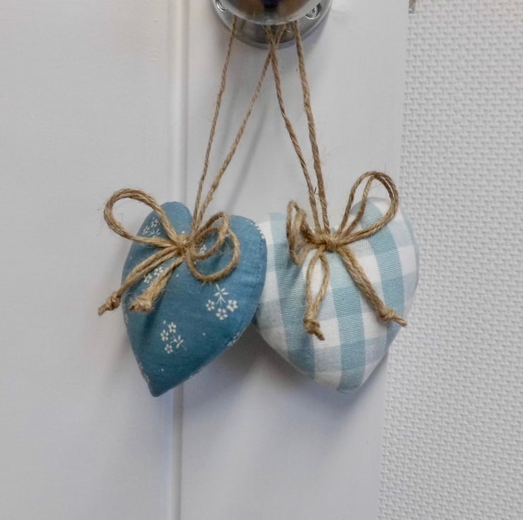 Two heart-shaped door hangers carefully made using two Laura Ashley fabrics. One is blue with a little white flower print, a vintage design, the other is duck egg blue and white gingham check.