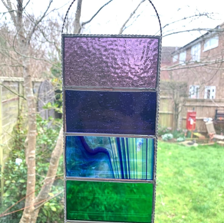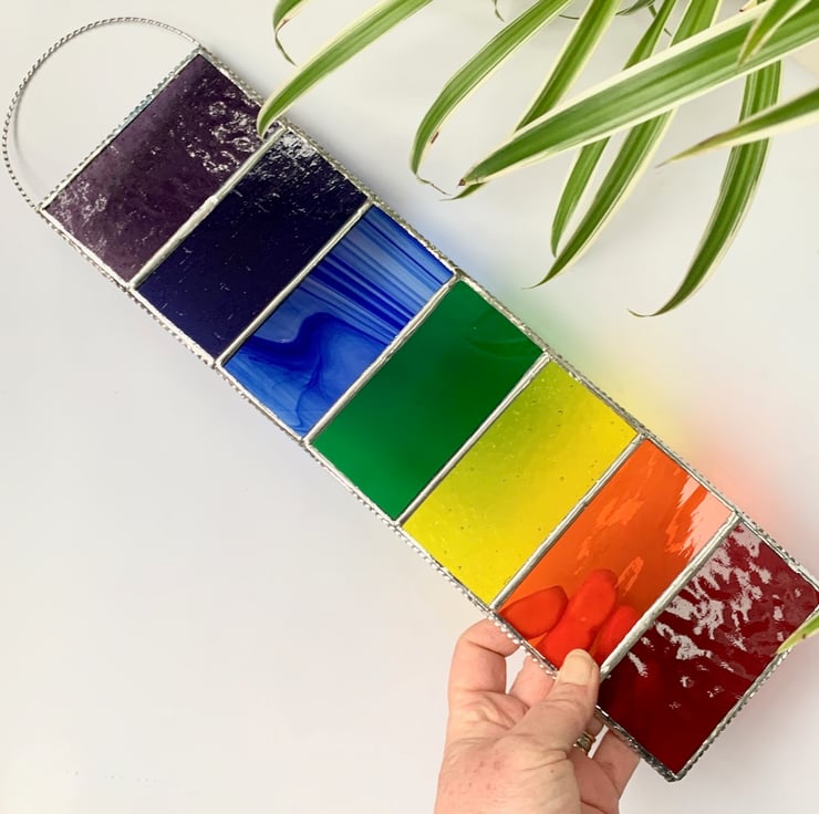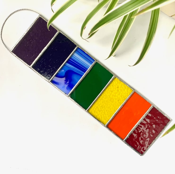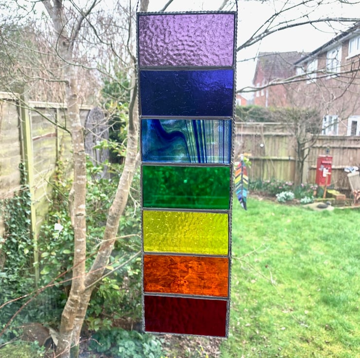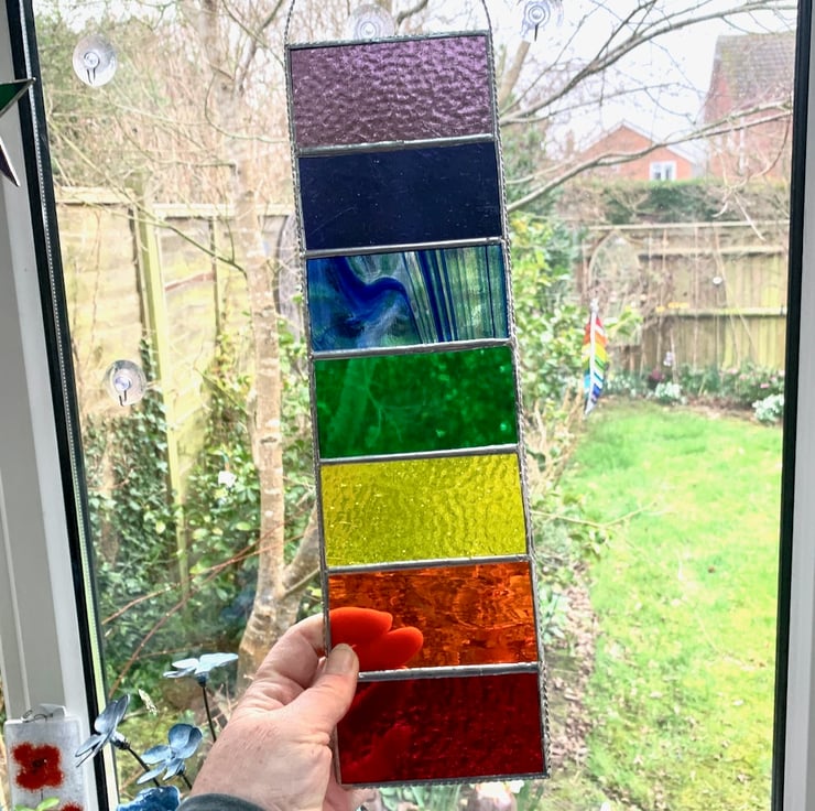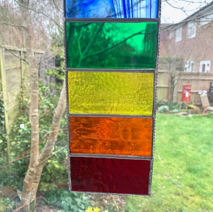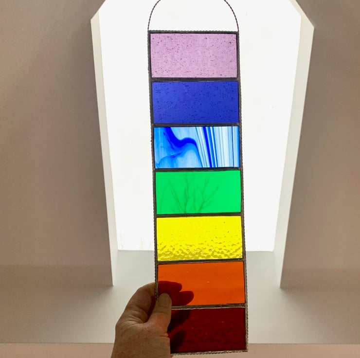 This has been made in vibrant coloured stained glass in the colours of the rainbow/chakra and have some lovely textures.