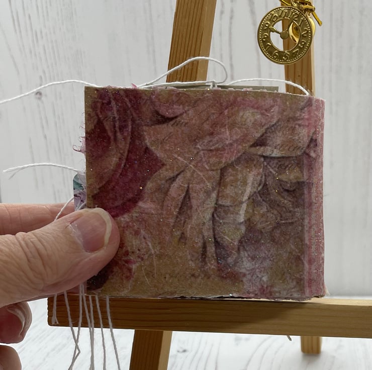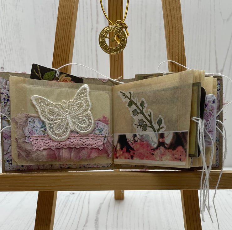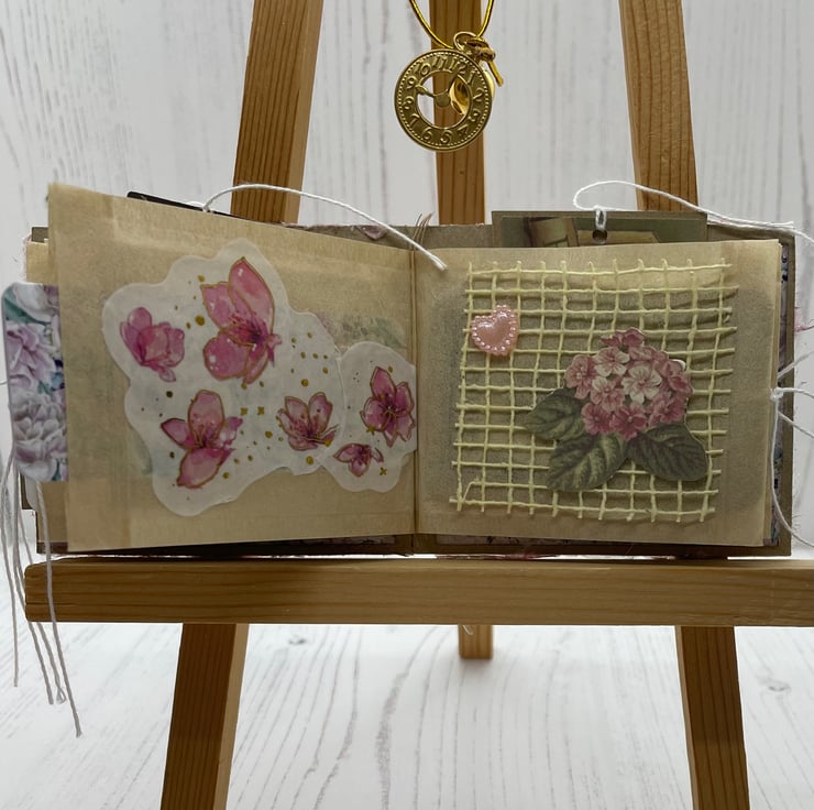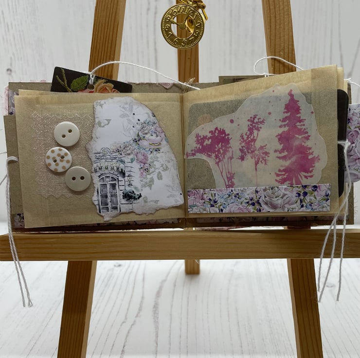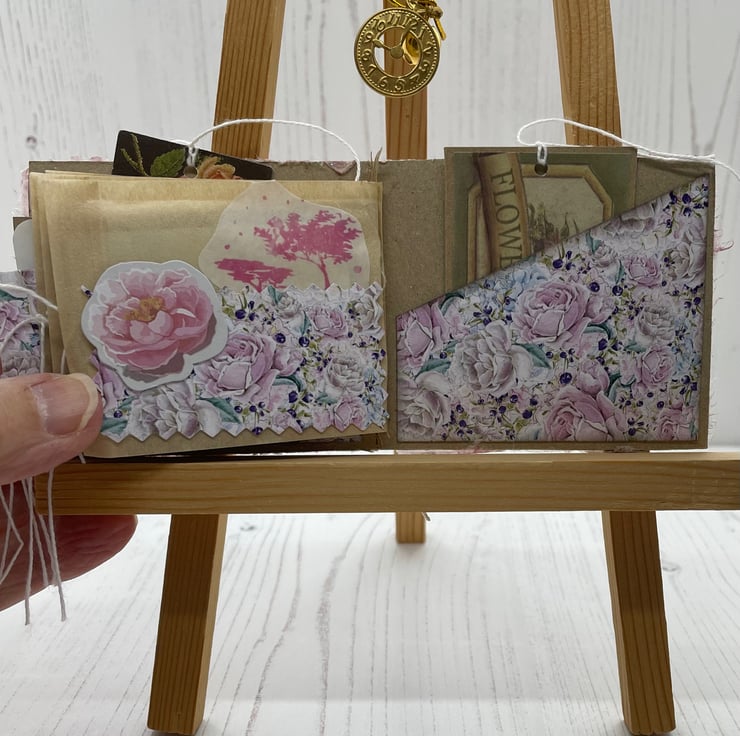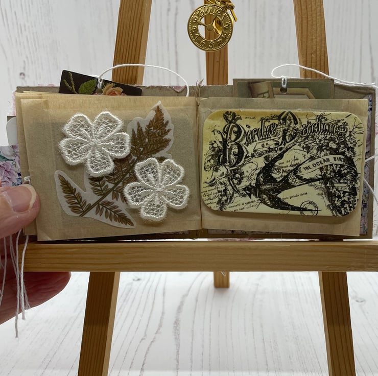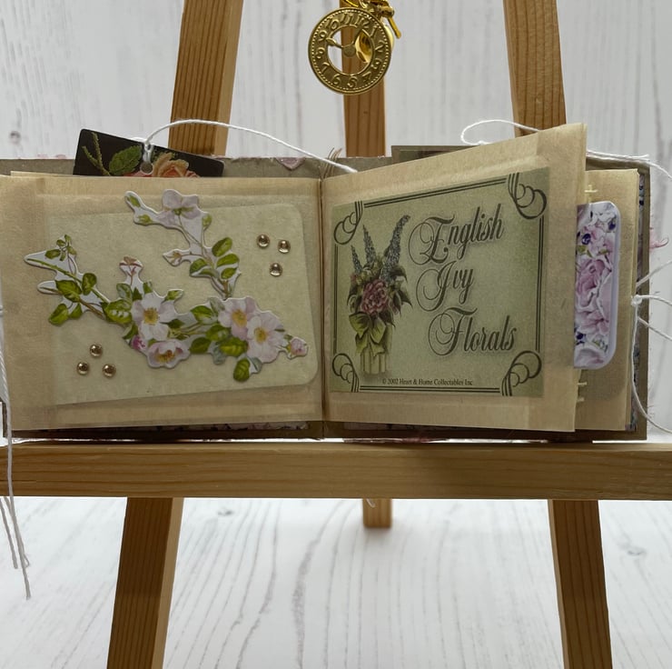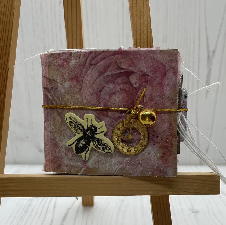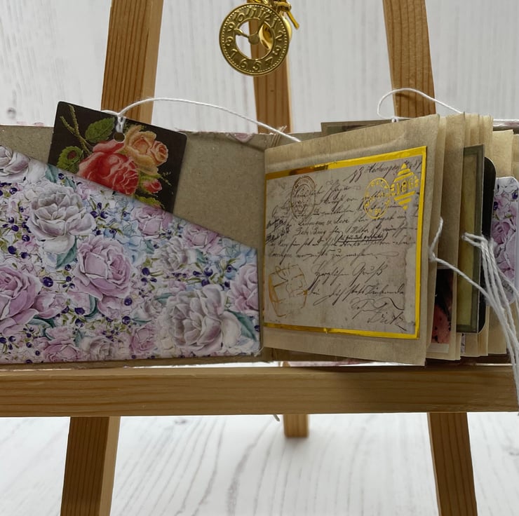 Small junk journal, filled with tea bag pockets each holding a tag or paper. The tea bags are decorated with papers, lace, buttons, stickers, vintage style images and advertising cards. The book cover is made from Kraft card and covered in a beautiful rice paper printed with roses. Sealant has given a glitter hint. Secured with gold elastic band with a watch charm and bell.
