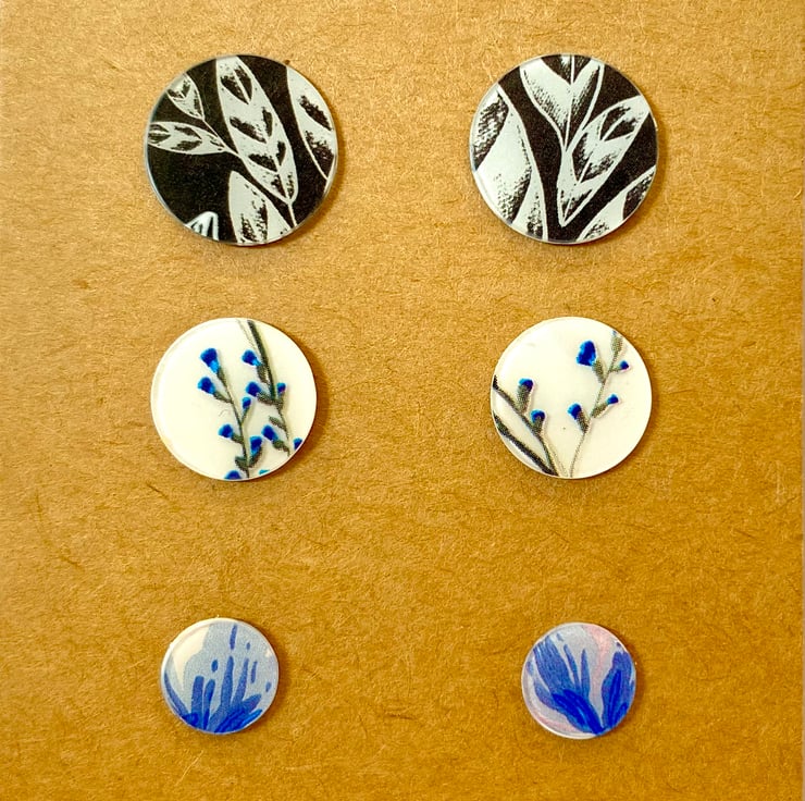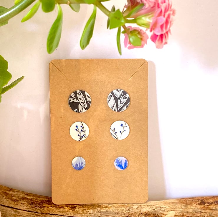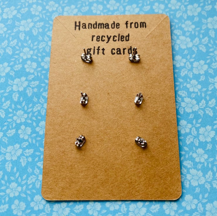 This set of three pairs of studs is perfect as a gift or for those who like a pop of colour! They have been handmade from recycled plastic gift cards, making them an eco-friendly choice. Cut out by hand and smoothed around the edges, they feature bright and vibrant patterns which have been carefully selected from the overall design. You’ll never be short on choice!