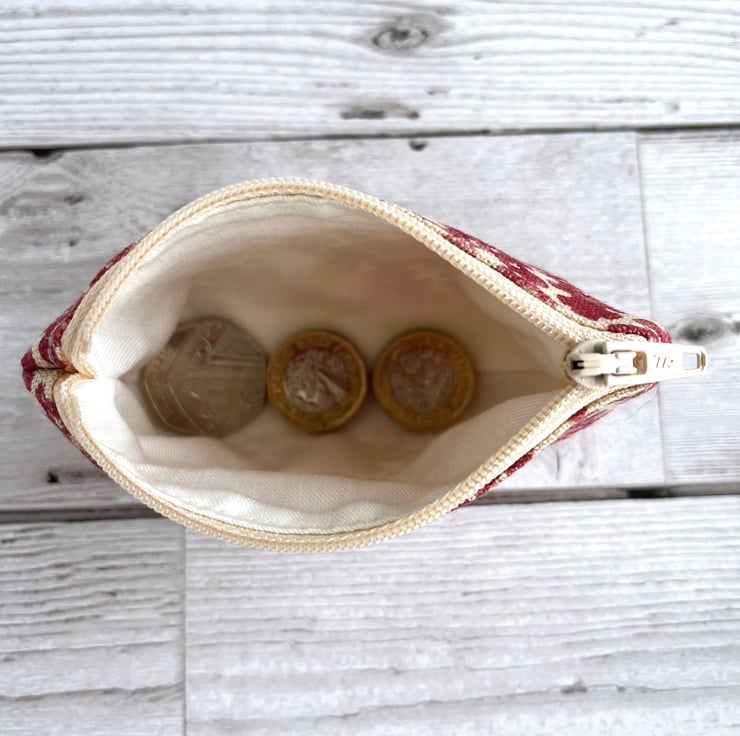 Small coin purse with abstract lattice pattern. This handy little purse has an unusual raspberry pink abstract print pattern on a warm cream coloured background. The pink pattern consists of diamond shapes with wavy edges arranged in a geometric lattice. There is a cream circle surrounded by radiating dashes in the centre of each diamond shape. The coin purse fastens with a matching cream zip and is lined with cream fabric. The base of the purse is boxed giving extra room inside.