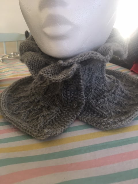 This cosy neckwarmer looks lovely over round necked jumpers or under jackets and is hand knitted in an intricate pattern which involves a pleated top section. Finished with 3 matching buttons it is easy to slip on or off without disturbing a nice hairdo and copies a vintage look.