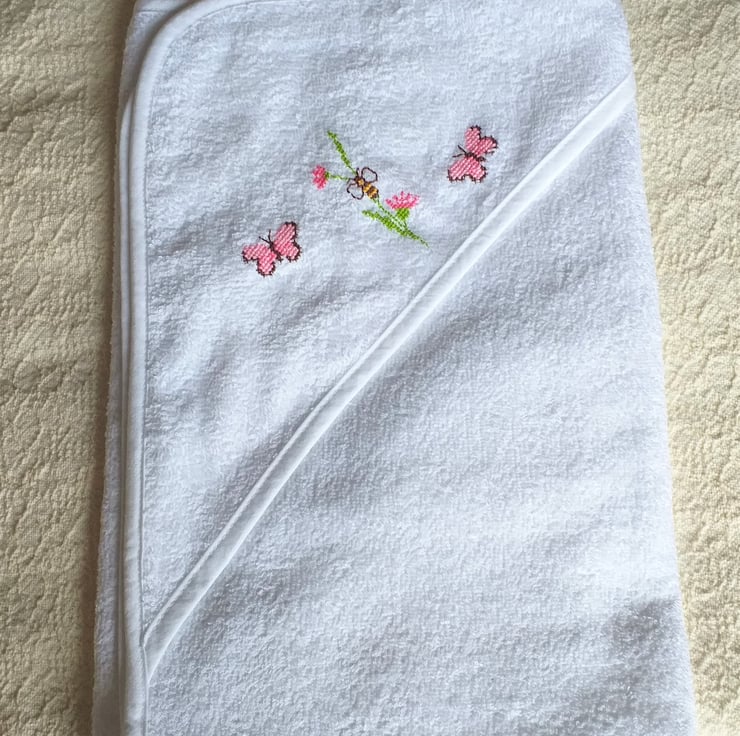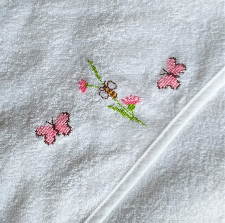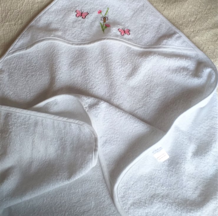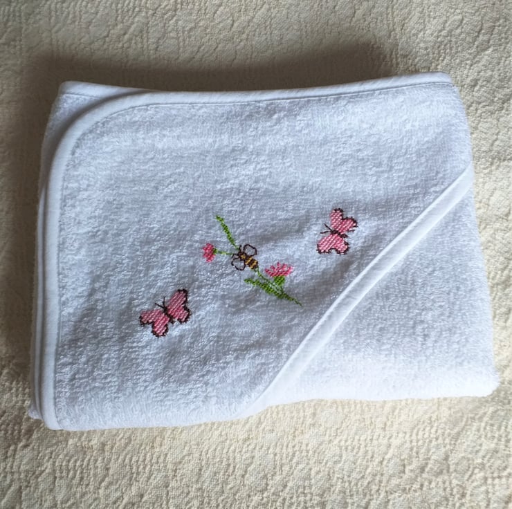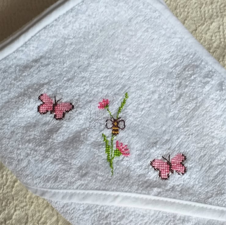 This is a lovely white hooded baby towel, upon which I have hand-embroidered a bee and two pink butterflies visiting toning pink flowers. The towel measures approximately 29" by 29" (75 x75 cm.) It is 100% cotton and can be machine washed to 40C.