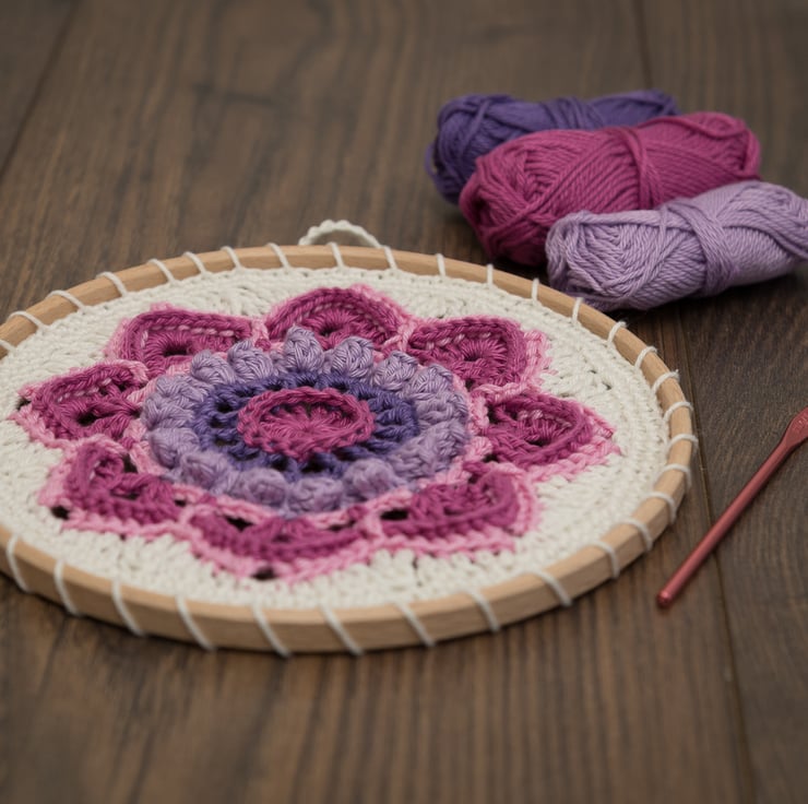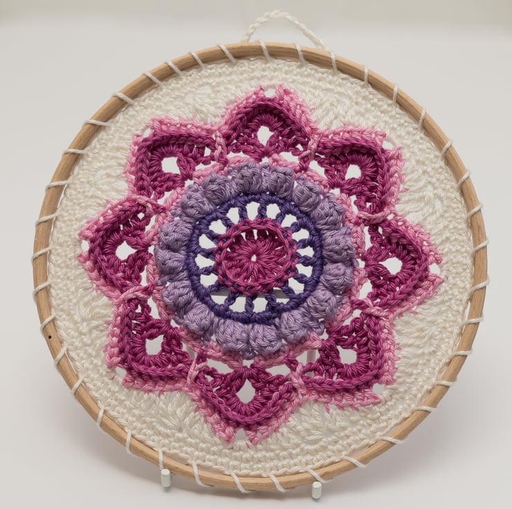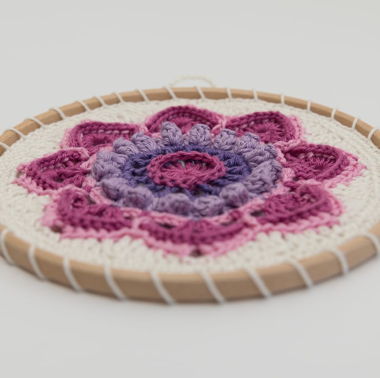 I have crocheted this beautiful floral mandala in shades of pink, purple and cream, inspired by fuchsia flowers. The pretty pattern of this mandala combines an open, lacy effect with raised surface texture stitches to create a piece of textile wall art that is interesting as well as colourful and beautiful.