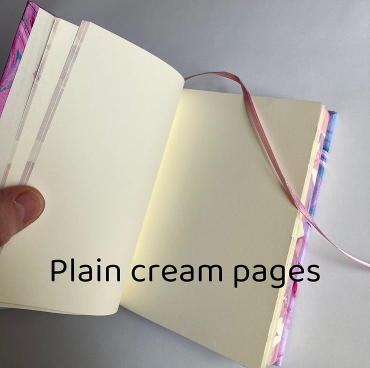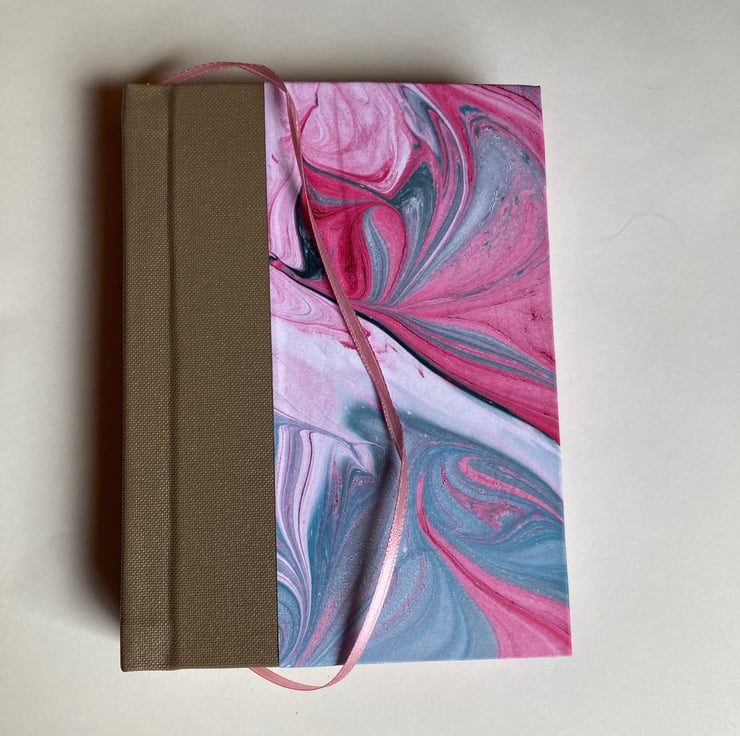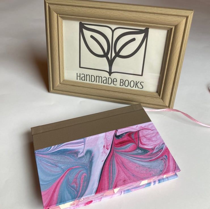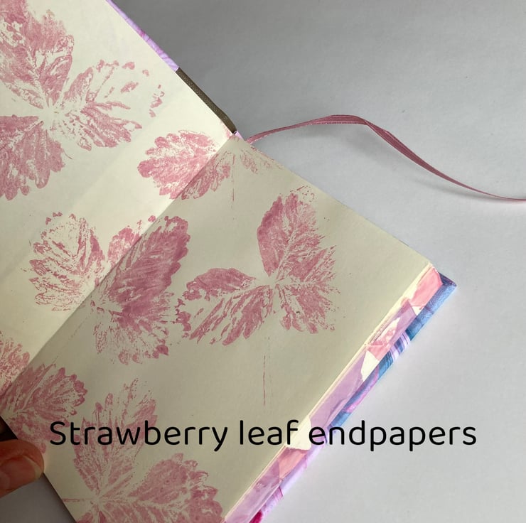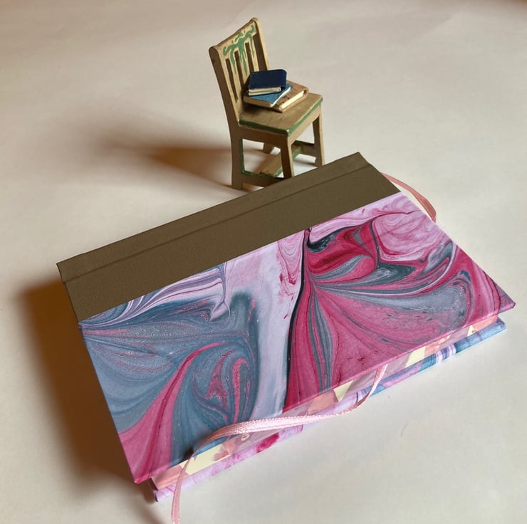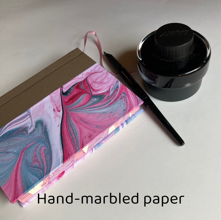 A pretty book for someone who loves to sketch; this is filled with many pages of plain cream good-quality paper. It is covered with hand-marbled paper and has strawberry leaf prints - pink on cream - as endpapers. The edges of the pages are decorated too. It measures 14.5 x 11 x 2cm (roughly A6 size) and will fit into a pocket or a bag.