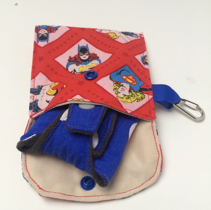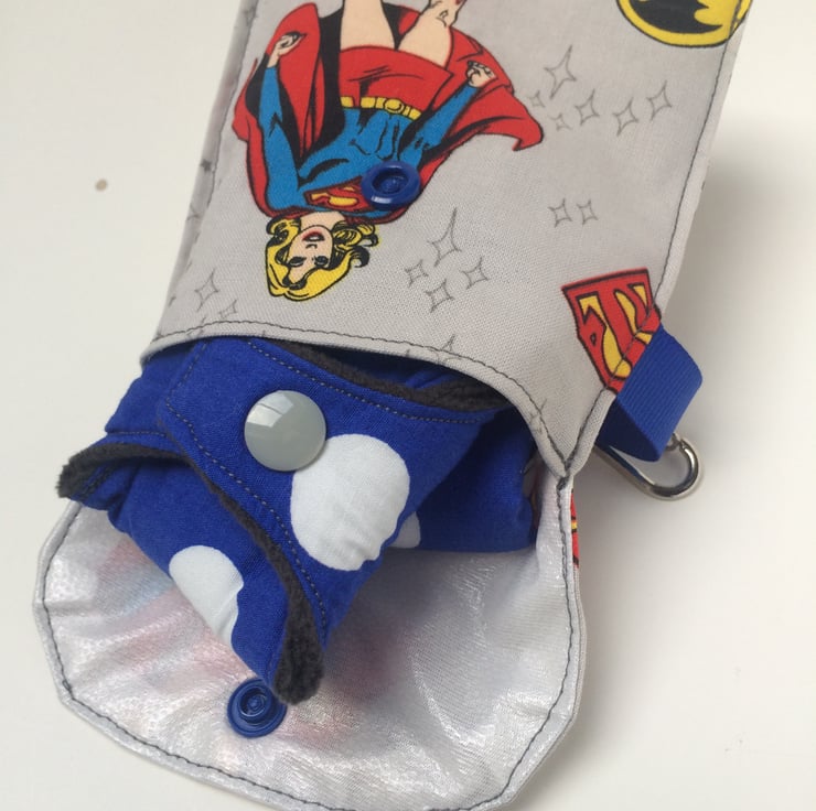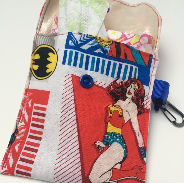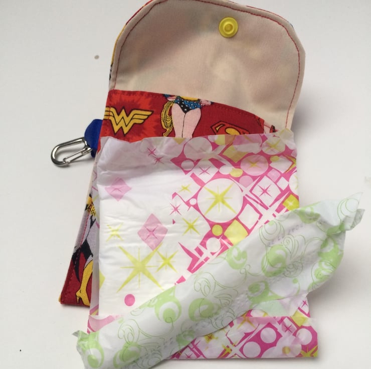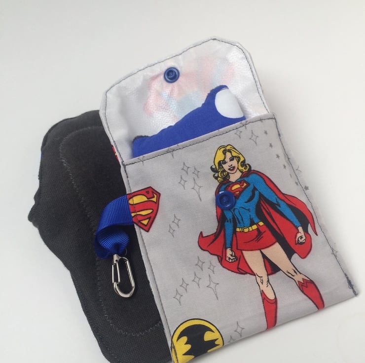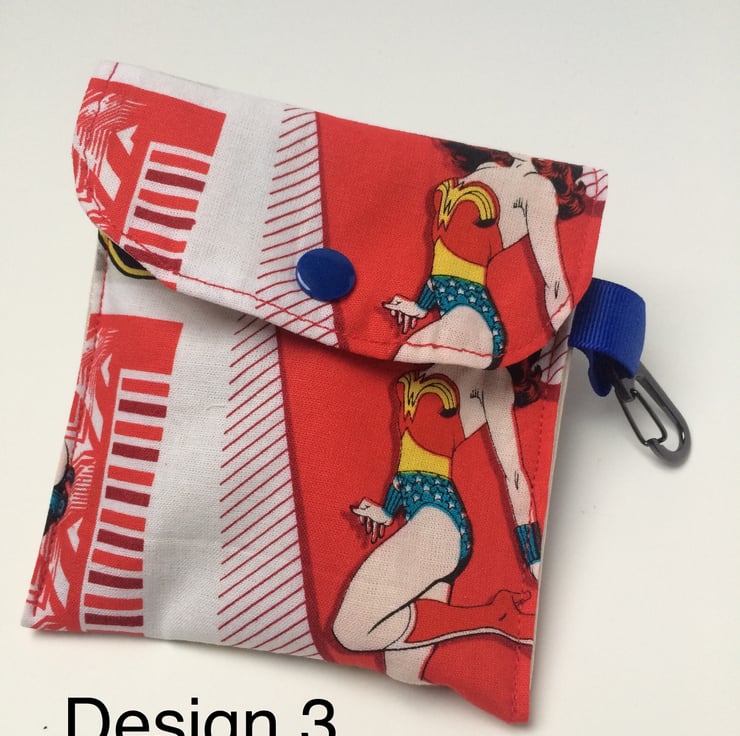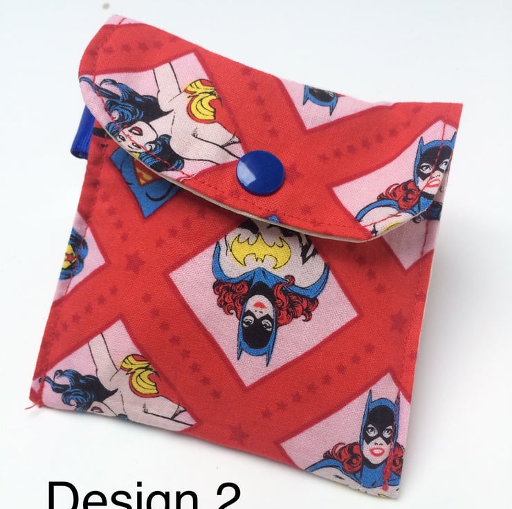 These pouches are made from exciting cotton fabrics featuring female superheroes and are lined with waterproof PUL. They close securely with a popper and then clip to your handbag, belt loop or keyring with a strong carabiner-type clip. The PUL lining means that this is the perfect place to store soiled, reusable sanitary pads, meaning that you can carry on your zero-waste lifestyle even when you’re out and about.