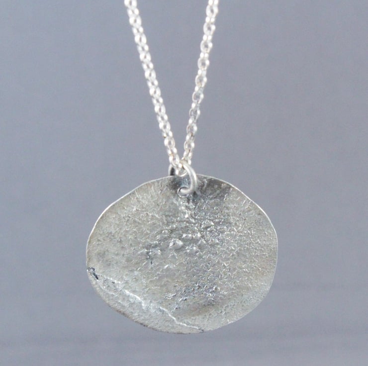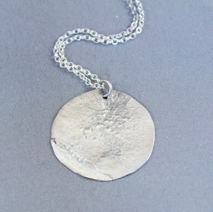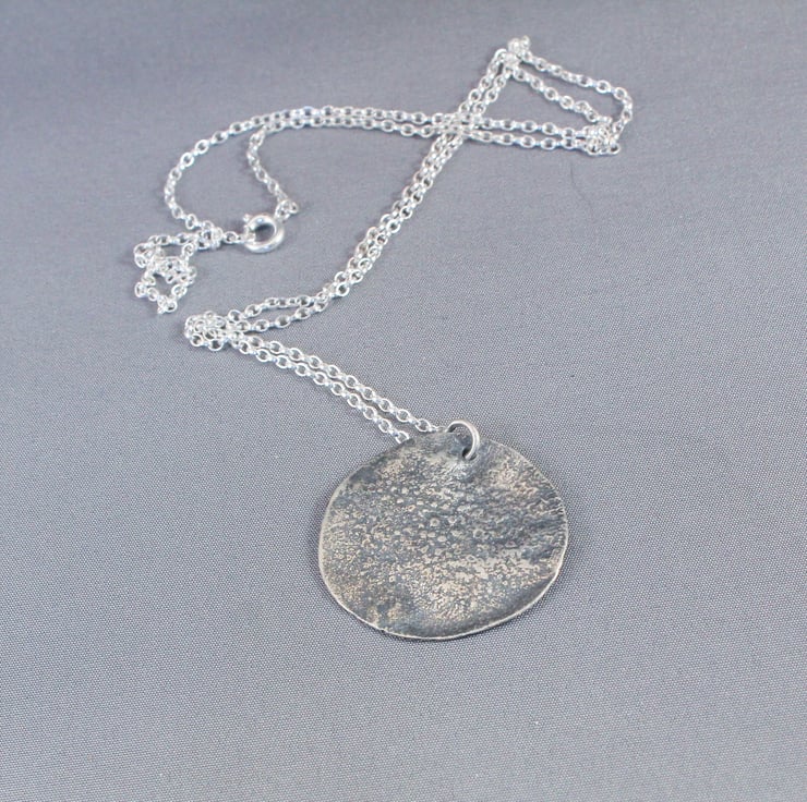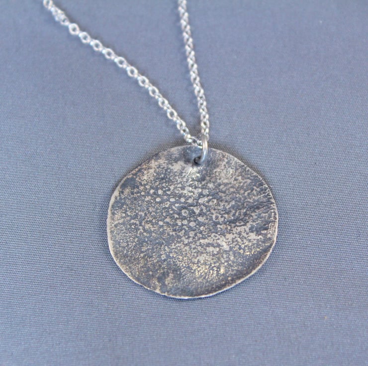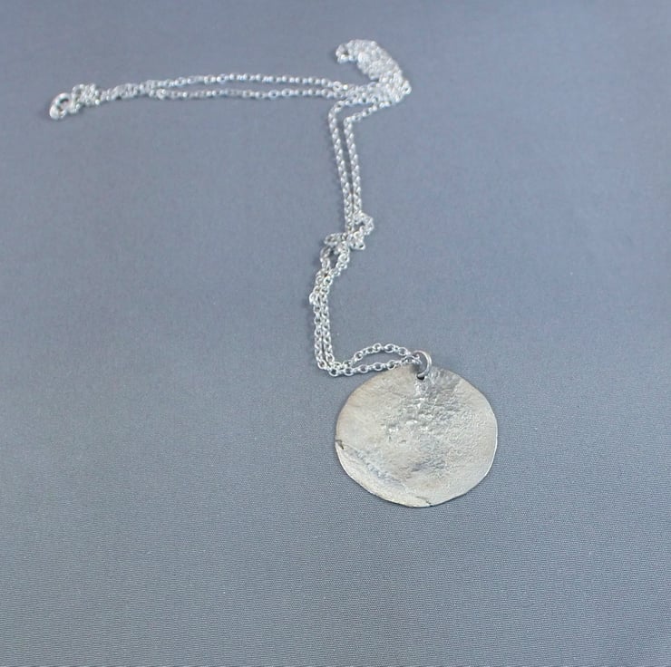 Circular silver pendant, the silver is reticulated, heated to almost melting point then plunged into cold water. This gives a random textured surface as the silver shrinks and wrinkles. I decided that it looked like a cratered moon so I cut a circle. I then drilled a hole for the jump ring.