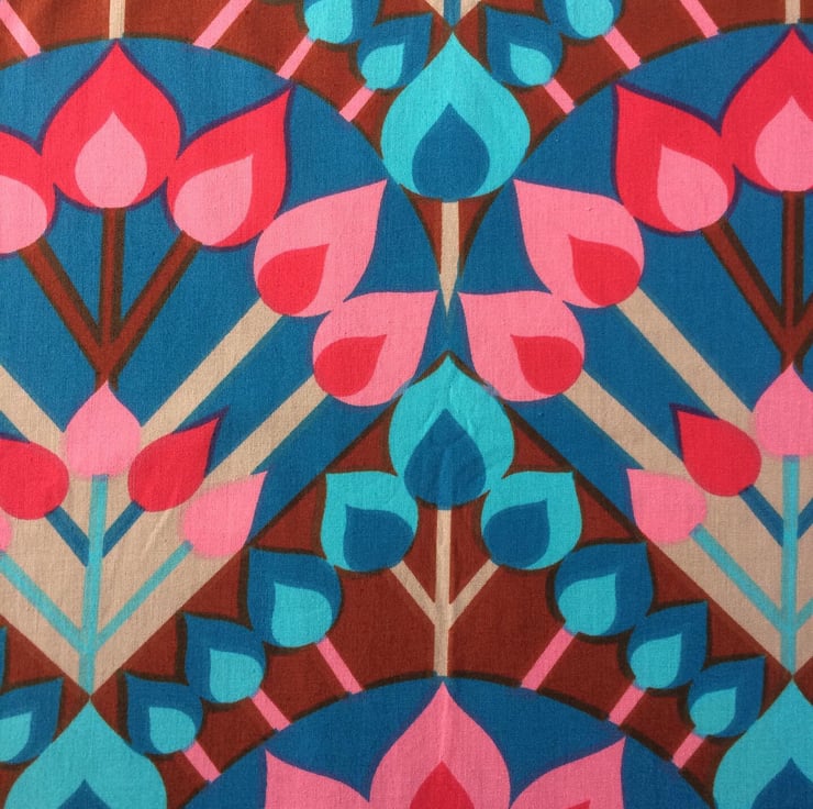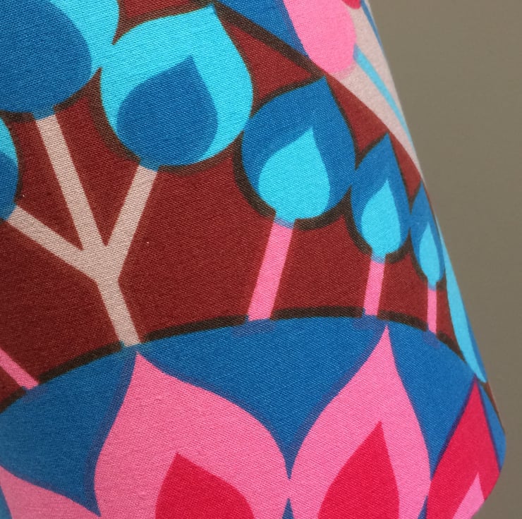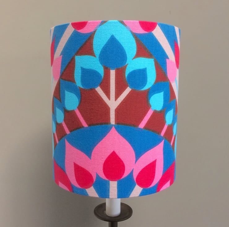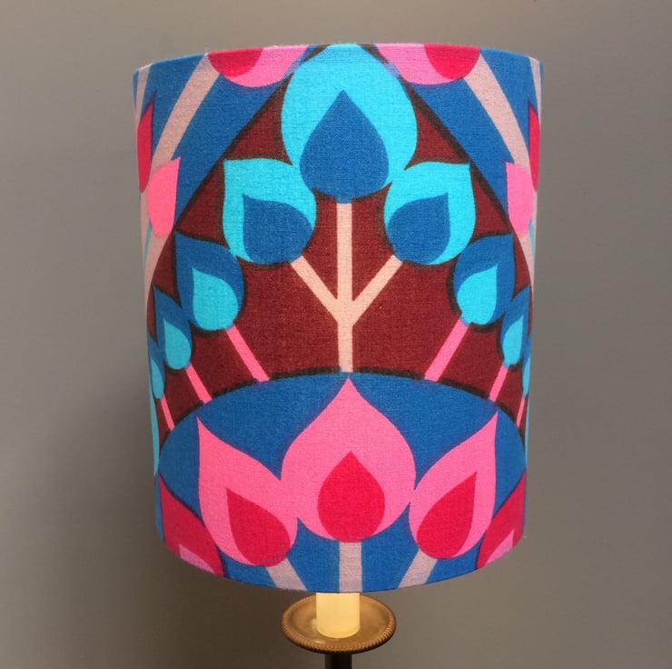 Hot Pink and Blue LUCIFER bold Vintage Fabric Lampshade - fabric is in lovely as new condition, very very faint central fold mark which I will take care to minimise impact of when using. Fidelus fabric designed by ....