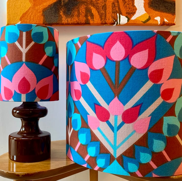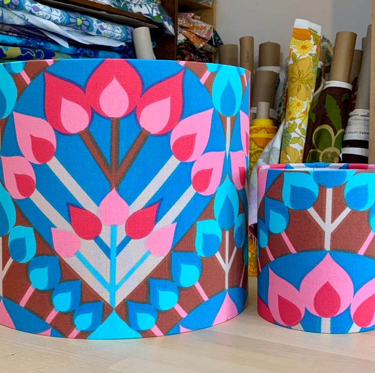 Hot Pink and Blue LUCIFER bold Vintage Fabric Lampshade - fabric is in lovely as new condition, very very faint central fold mark which I will take care to minimise impact of when using. Fidelus fabric designed by ....
