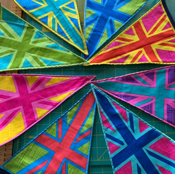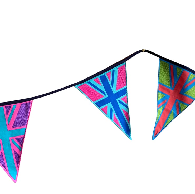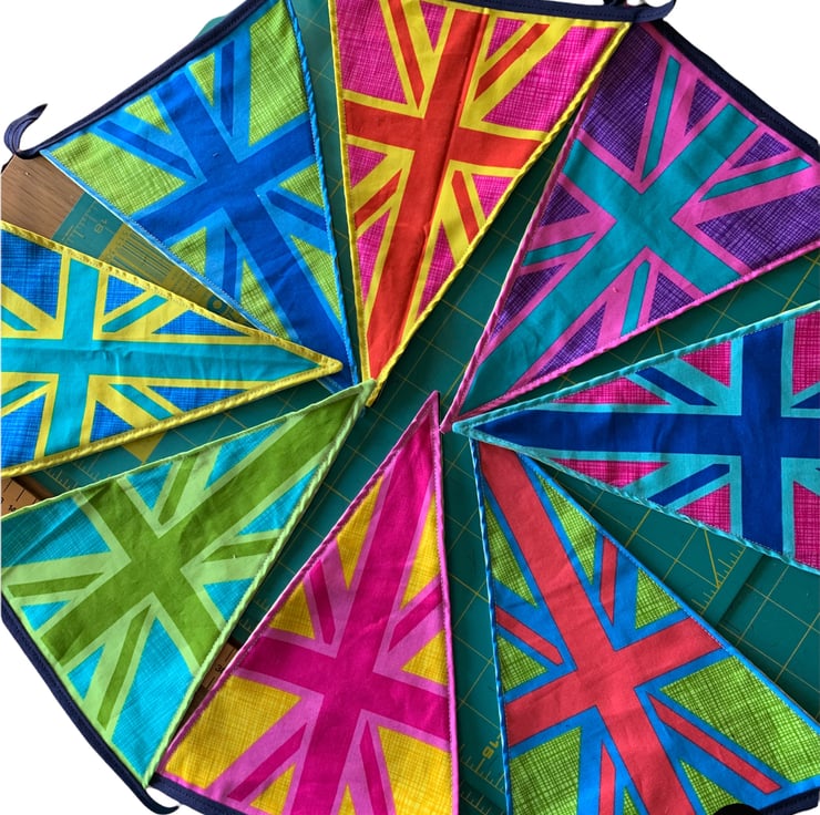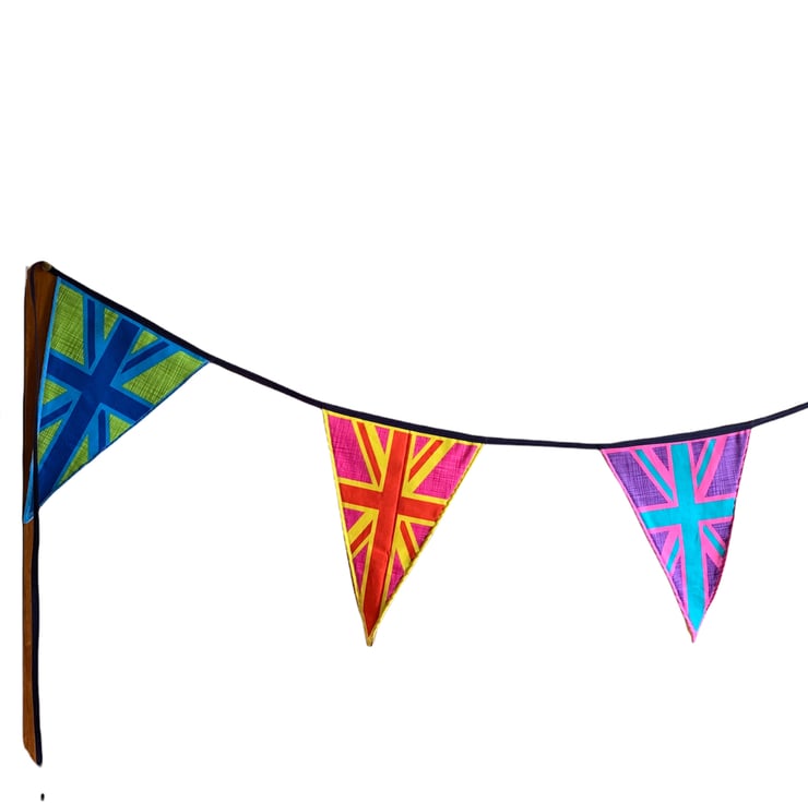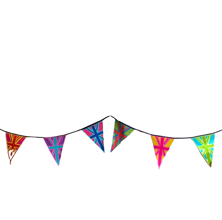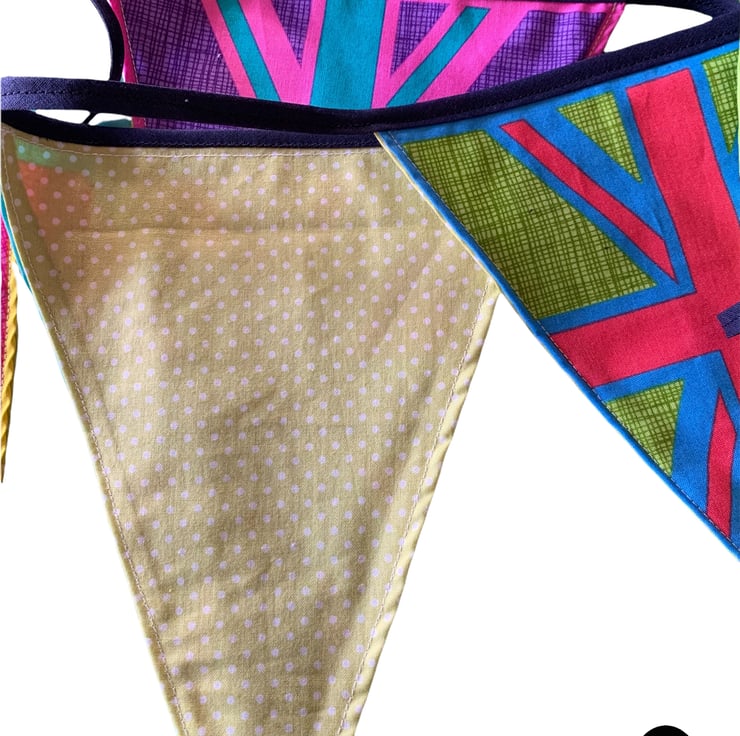 The bunting consists of the flag on one side in neon colours and lime green polka dots on the reverse so after the celebration this year just turn it round for a different look.