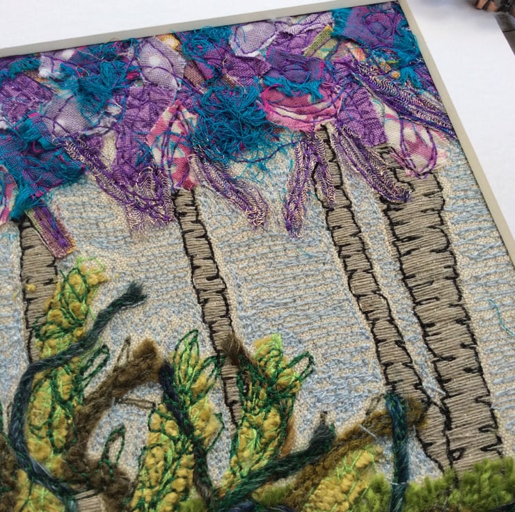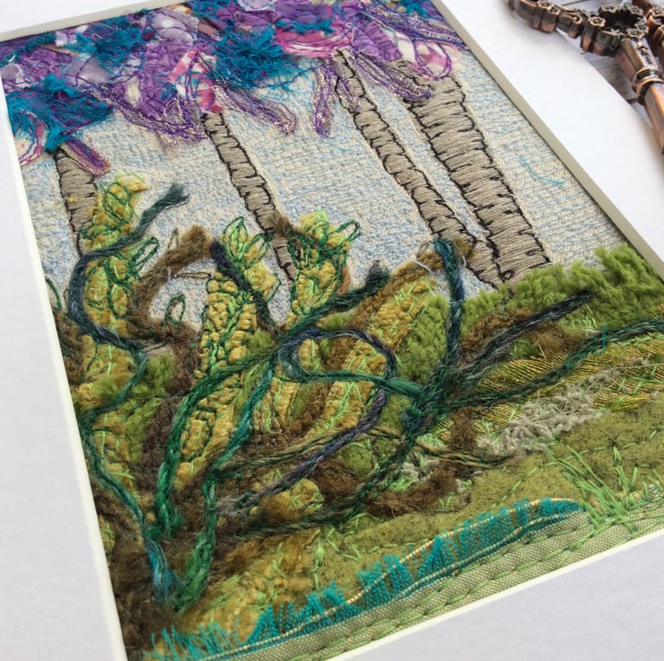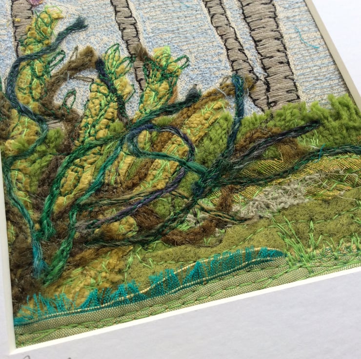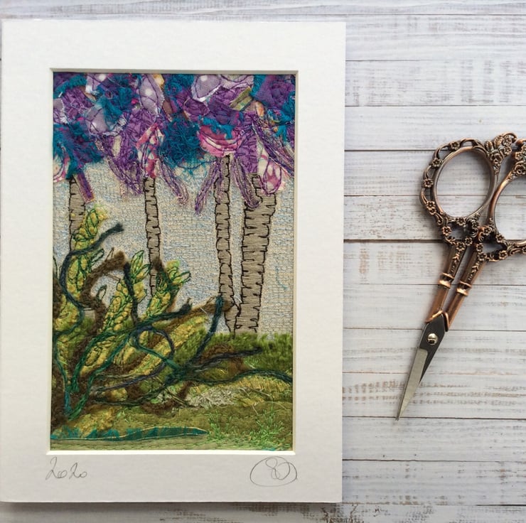 This sweet little embroidery shows stylised trees with greenery and plants. It’s made with up-cycled fabrics, free motion embroidery and it comes mounted. The artwork measures 10.5 x 15.5cm. The mount measures 12.5 x 17.5cm and the mount window measures 9 x 14cm.