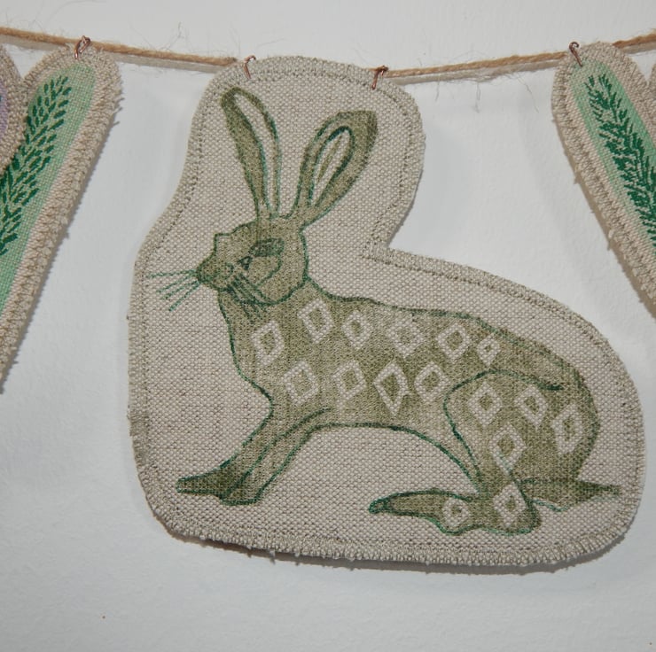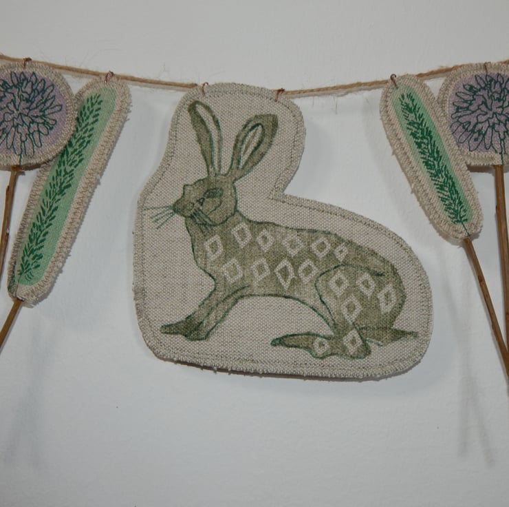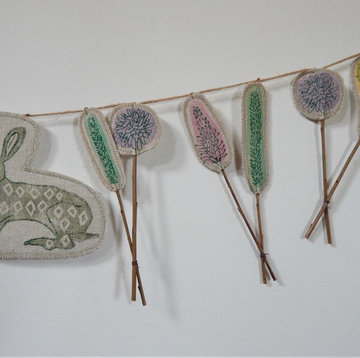 This is a wall hanging/bunting that measures 70cm flower to flower, with at least 30cm of jute twine at each end to hang with. The reverse of the flowers and hare is a plain cream piece of fabric, this means it is one sided and best for a wall or a piece of furniture.