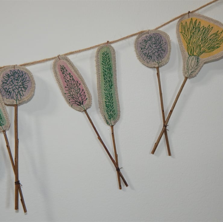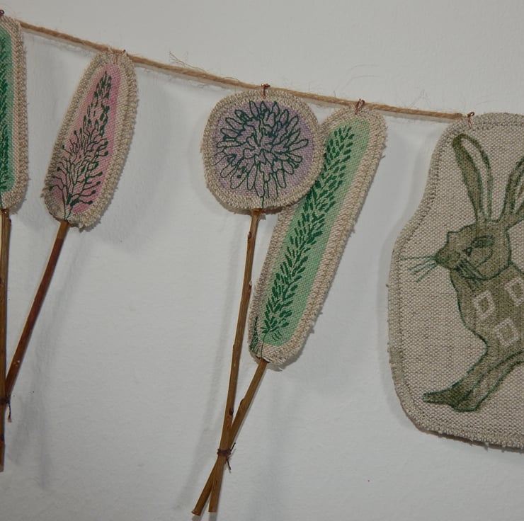 There are 12 wild flowers and 1 central hare, all are screen printed from my designs and have simple lino prints for a pop of colour. There are scabious, hoary plantain, wild grasses and salsify, each has a willow stem and they are collected in pairs with a tied piece of cotton. The flowers measure 15cm approximately, from flower top to bottom of willow stem. The scabious flower measures 4cm in diameter, The hare is about 14cm by 13cm.