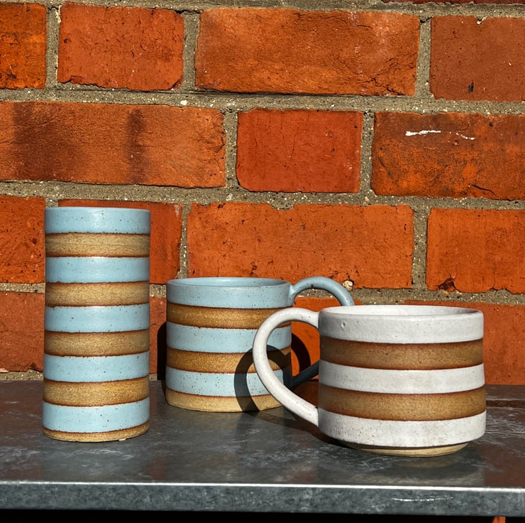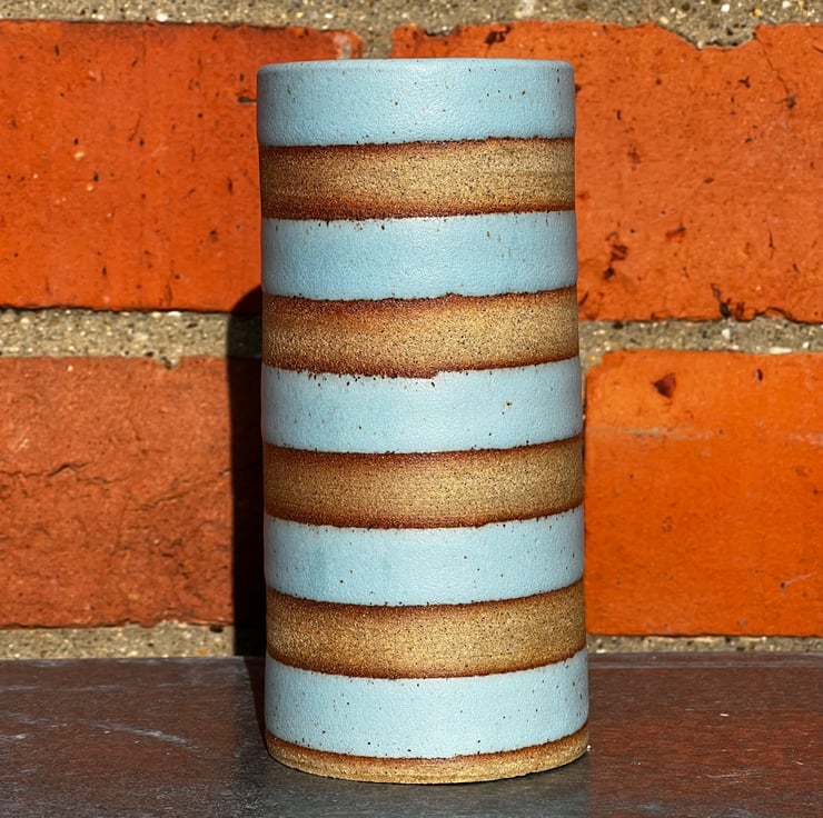 This is a hand thrown pottery cylindrical vase in Robins Egg blue. It has a lovely tape resist stripe detail showing off the toasted raw clay contrast. It looks lovely grouped with other jugs and vases in the same colour or with one of my other striped styles.