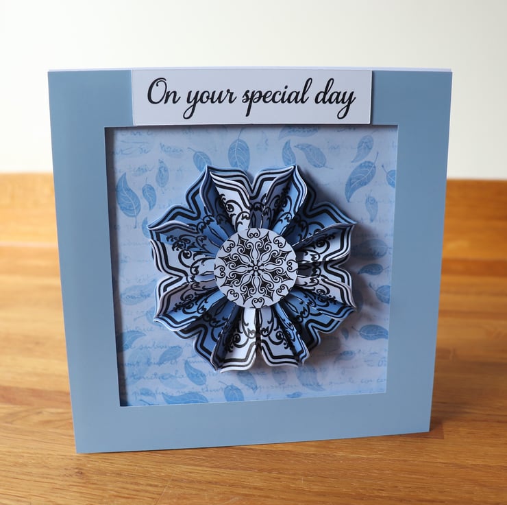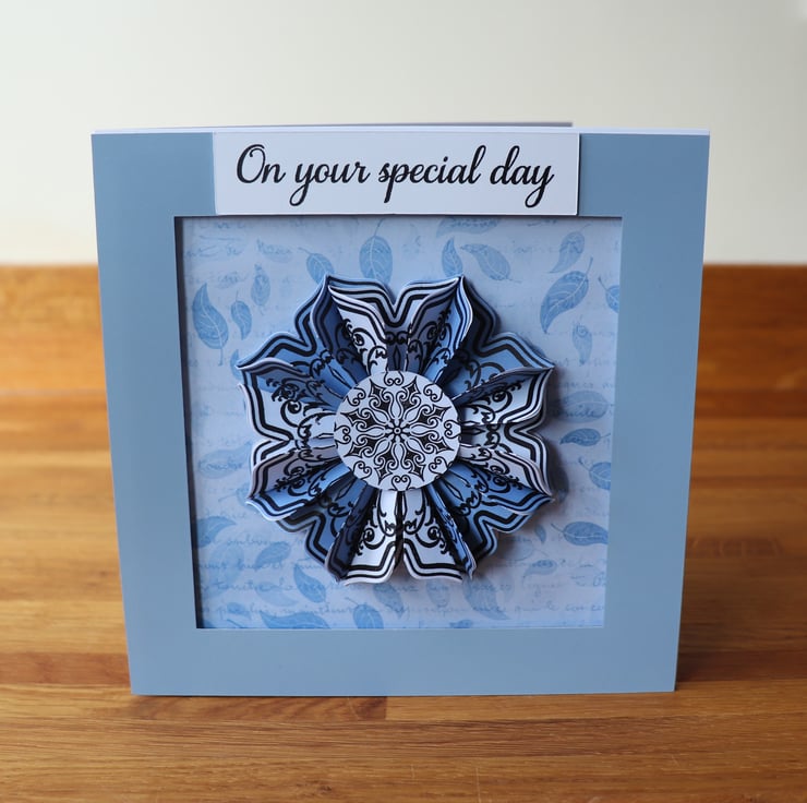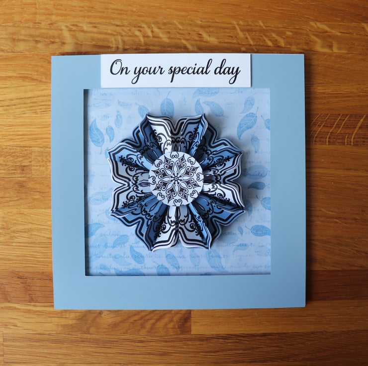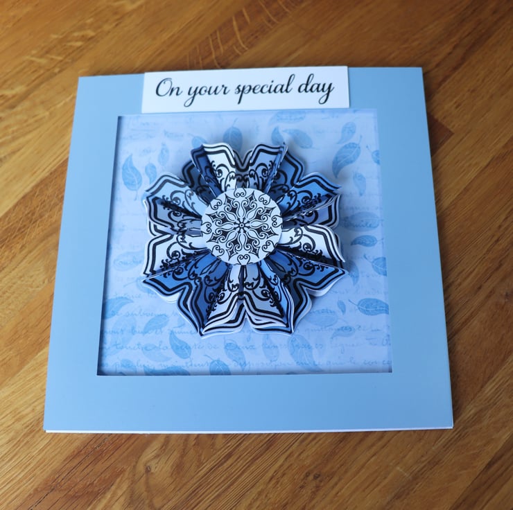 This card has a traditional tea bag fold on a light and dark blue paper with a stamped mandala design and the backing paper is a pastel blue leaf design the frame is in blue.